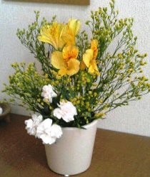 えー、今月はフラワーアレンジがないみたいなんで自分で切花を買って来ては、適当にアレンジして玄関に飾っているんですけどね・・・やはり、このところの気温の高さからか持ちが悪いんですよねー、かなり早くダメになってしまいます。1週間ほど前に玄関に置いた切花のアレンジも、もうくたくた。なので、今日水路探検のあと、すぐ買出しに行ったときにちょっとだけ切花購入。 でもさぁ~~、ボリュームがないので・・・また花器利用の縦アレンジに。そのまま花瓶に生けてもいいんですけどね~手前の白っぽいカーネーションは、先日ポットで買ったものをちょっと切って使ってます。一度、玄関に花を常駐させると、枯れてなにもなくなった玄関って、なんか寂しい・・・・だから、また置いてしまうんですよね・・・