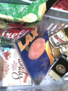 スイーツの他に、食材も少し買ってきたんですよね~買い物カゴのなか・・・・ ダンナは、今回初めてだったし、こういう輸入食材がやっぱ好きなので、あれこれカゴに入れてましてーチーズ ブラック という、プロセスチーズというか、普通のハードタイプのチーズになんか地酒?みたいなもの、あとスナックも買ってました。これは別記事にします。私は、前回買ったサーモンマリネ が欲しかったんですよね~、レストランでも食べたものだし。でも子供たちがカゴに入れたのはスモークサーモン 私は荷物番してたんで、ちょっとわからなかったけど、昨日は無かったのかなぁ~???それと、レストランでサーモンマリネについてくる、サーモンソースも、 昨日は売っていたので買ってきましたっなんか、甘酸っぱくてハーブが効いていてちょっと癖になる味。ミートボールもそうなんだけど、ハーブとかベリーソースなど、自分が使う食材とはちょっと違う感じが新鮮なんです。