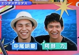 カテゴリ再分類中です~レポするの、遅い~舞台終わってるし。スミマセン、後手後手で王様のブランチ エンタメデミダス 8月6日OAブランチのワンコーナーで、この夏の舞台12人の優しい殺し屋~狙われた豪華客船~そのキャストがそろって、番宣をしたときの模様です・・・・簡単にね、アップしますんで~ 中尾明慶さん、阿部力さんがダブル主演を務める舞台、8月16日からの公演に向けて連日稽古に励んでいます・・・といった感じで、舞台の練習の様子も映りつつ、 メインキャスト5人にインタビューです。 中尾くんに冬冬くん、そして竹内寿くん、菊田大輔くん、古川雄輝くんの5人。正直、竹内くんはなんとなく顔知ってるけど、他のお二人は知らなかった・・・スミマセンでも、今回で少し覚えた。菊田くんは、声もいいし、めがね似合いますね~・・・という情報がインプットされましたっ古川くんも、年齢よりもずっと落ち着いた声です。中尾くんの声が高いだけに、、、、Q:どんな内容のお芝居か? 中:僕らは(中略)殺し屋なんですけど、ミステリアスだったりサスペンスだったり、 アクションだったりと・・・やったことないことも挑戦していこうぜ、 っていう企画なんで・・・Q:この中でムードメーカーは?中:まあ、(竹内)寿が、最年少で・・・常にへらへらしてる・・・一同:(笑)中:ダンスも挑戦してるんですね。僕、ダンス経験ないんですけど 寿はダンス部に所属していたこともあって、割とダンスが得意なんですよ。冬:あぁ~・・・・・・中:自分できるもんだから、ダンス稽古終わって、 ”中尾くん、ダンス経験どのくらいだっけ?”って・・・竹:なんでそういう、ちょっと悪い言い方するんすかっ!?冬:(冷静に)だから、あれでしょ?・・・・ バカにしてるんでしょ??一同:(爆笑)竹:違うんですよっ(手をばたばた)といった感じで、とりあえず今回の番宣の企画発表ー・・・は、その2に続く