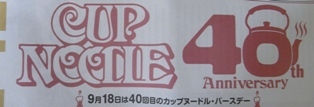 昨日の、うちで取ってる夕刊には、前頁に渡って大々的に広告が載っていました。他の新聞もそうだったのでしょうか。9月18日 40回目のカップヌードル・バースデー昨日の新聞には全面広告も含め、たくさんの広告が載っていました。すごいね、日清。 永瀬正敏アニキも載ってた♪にしても、40周年、スゴイなー私が小さい頃からあった、ってことですからね。私のほうが先輩だけどで、この連休は、記念館のある 本拠地大阪の池田や、梅田でも、イベントがあるみたい。それに、とうとうというか、満を持して? みなとみらいに、池田の博物館と同じような体験ができる+αのミュージアムも昨日オープン。 昨日の王様のブランチでも話題に。自分でオリジナルのカップヌードルを作ることができる、ということで、レポートしてたけど案外関西の人以外は、知らないのかな・・・ブランチのスタジオでも、 おぉ~、なんて声が上がっていたし。この、横浜のミュージアムは、建物も大きくておしゃれですが他にもアジアなどの麺料理が食べられるフロアもあるとかで面白そうです。池田のインスタントラーメン発明記念館ですが、案外普通の週末でもにぎわっています。予約必要ですが、自分でラーメン作ることも出来るし、スープや具材を選ぶオリジナルカップなら、予約ナシでもできるし、それも安価ですからねー小さい頃、やはりインスタントというのはどうにも食事の支度をさぼったときのもの、とか体によくないもの、とかいろんなイメージがあって、あまり食べさせてもらえず、自分でも進んで食べた記憶はありません。それでも、こうして40年も愛され続けるというのは、すごい発明ですよね。いろんな種類のカップ麺がいろんな会社から出ていますが、結局一番はカップヌードル・・・というかたも多いのでは。Happy Birthday!!!