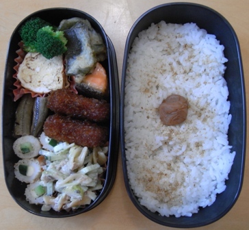 新人戦弁当・・・といっても、紅実がベンチ入りしてたわけでもないし、試合といっても特別凝ったものを作ったわけじゃありません昨日の弁当。 ご飯(白すりゴマ、アイス梅干)マカロニ・きゅうり・ツナサラダ(前日の取り置き)きゅうり、チーズ入りちくわししゃもチーズハムかつ(冷凍)焼き鮭卵焼き茎わかめ入りかまぼこの味噌ポン酢炒めブロッコリーついでに、休日出勤のだんなも作ってほしい、とか言うから、かなり少なめですが、一部利用してにたようなものをもってってもらいました。ダンナはちなみに、これにカップ麺+です