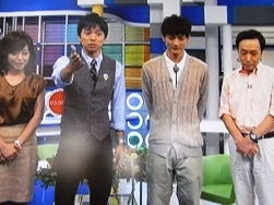 カテゴリ再分類中です~というわけで、遅いアップでスミマセンコーナー、後半です。王様のブランチ エンタメデミダス 8月6日OAで、今回の番宣の企画発表ーイケメン自己申告! 私がナンバー1他の4人には負けない!という特技&自慢をアピール!とうもの。・・・しっかし、何でもイケメンっていえばいいってもんでもなかろー・・・って思ってしまうんですが。名前を伏せて、最初にでたフリップは、、、、 「自転車」・・・これは誰だかすぐわかるQ:これはどなたですか?冬:(一応後ろ振り向いたりして)これは、、、僕ですね。 舞台って、結構あのー、体力がいるものじゃないですか。 だから、ここ・・・この稽古が始まって・・・え~、、、から、ずっと、ここまで 自転車で通ってます。 往復で40kmは!通ってますね・・・中:何が楽しいの???菊:(後ろで笑ってる)冬:(中尾くんに手をかけて、弁解しようとするが、、、)中:いろんな人が乗ってるけど、何が楽しいのか理解できない! 坂道とかみると、興奮するんでしょ??冬:まま、、、、それはたぶん・・・人それぞれだと思うんだけど、 まずまず、自転車っていうのは、エコだからね?中:まあ、それはね・・・冬:(中尾くん指差して何か言いたそう)えへへ・・・という感じでしたが、、、冬冬くんならムエタイだの写真だの中国語だって、なんでも言えそうな感じはするけどねえ。つぎは、ブレイクダンス=古川くんでして、ちょっと披露してくれました。(多少、微妙な感も・・・)でも、最後は腕が変な角度で止まって、みんなにもオオウケ。中:自転車がショボく感じるね! 冬:オイ!(笑)それを言っちゃあ・・・竹内くんは、冬冬くんに手をかけて笑ってます。お次は、スキージャンプ=竹内くん、お兄さんがバンクーバー五輪の日本代表で、竹内くん本人も全国大会4位だったことがあるそうな。驚くみなさん。冬:それは、いくつのとき?竹:中3のときです。冬:マヂで?すごいな・・・・(とツッコミナシで感心する)そして、字=菊田くん・・・・この字がビミョーに・・・下手自分的にはアートに感じる字を書くのが好きらしいんですが、、、、その場で披露した字は、、、自分のサインじゃんっなかなかのお茶目さんですな。中:きっと菊田くん、特技無いんだね・・・・最後に、女子への興味=中尾くん・・・・オイオイ中:菊田くんのこと、特技ねぇ、って言ったけど、 ほんとに俺も(特技)ないの!でも、本人的には、こんなに男子ばかりのカンパニーなのに、グラビア見て盛り上がるとか全然なくて、すごく不満なんだそうです確かに、その不満を訴える中尾くんの周りの4人は、冷静にうなずくだけ・・・・笑えた。一応最後に舞台告知をして終了。 女子への興味、とか言った後に、説得力あるかな???と中尾くんは心配してましたがたぶん、中尾くんはいまどきの、あのくらいの男子の普通な姿なんだと思います。同じくらいの年齢の時にはすでに落ち着いていた冬冬くんにもまして、菊田くんや古川くんも、結構おちついているように見えましたねー竹内くんは、、、、若いんで皆の弟って感じ?ま、この雰囲気は舞台DVDで確認してみようと思います