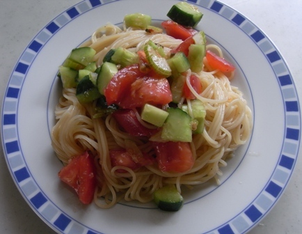 昨日の昼に作って、百々椛と二人で食べました。カッペリーニのサラダパスタ 作り方 1:好みの太さのパスタを茹で始める。 少し細めで作る。 2:大き目のボウルに、1cm程度にきったトマト、きゅうり、セロリ、 刻んだオリーブの実をいれ、塩コショウ、オリーブオイル、レモン汁、 昆布茶などを入れてよくなじませる。 3:1の麺を2に入れて、冷蔵庫で軽く冷やして盛り付ける。少し、ボウルでつけ置く感じなんで、パスタは少しだけ固めに茹で、茹で上がったらよく水で洗って熱を取って混ぜるといいです。面倒なときは、オイル系のドレッシングを少し加えて味調整も可能。昨日は、前日買い物に行った輸入食材屋でカッペリーニが安く買えたのでカッペリーニを使いました。ドレッシングの場合は、私はピエトロ利用が好きですディチェコNO.9 500g袋入りも日本一に挑戦!!ってかダントツジャン!!最高級ブランドNO.1パスタ!!ディチェコ NO.9 カッペリーニ (0.9mm) 500g<食品・調味料>驚きの%offグラノーロ カッペリーニ No.16 500g パスタ 非常食・保存食にもピエトロドレッシング グリーン 280ml/ピエトロ/和風ドレッシング/税込\1980以上送料無料ピエトロドレッシング グリーン 280mlこちらの商品はお届けに、ご注文日より7~10日頂戴致します。【うまさ発掘!おとりよせ】ピエトロドレッシング和風しょうゆ味 280ml 5本ショッパーズ福岡店