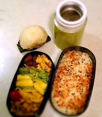 というわけで、一般生徒はとっくに午前授業だが部活があるため、、、そして今朝は朝練にも行ったため、フル弁当。月曜弁当 鶏レバー入り塩握りお麩とわかめのかぷスープマグロフレーク+白米肉豆腐(取り置き)ブタのトマト煮(取り置き)ミニコロッケ(冷凍)ブロッコリーと小エビのシーザー―風+サラダ菜卵焼きミニトマト部活も、最短だとあと2カ月とかになってしまい、いろいろあったようですが、また朝練復活です。なので、その分弁当早いからなー今日からキモチ早く帰ろう・・・