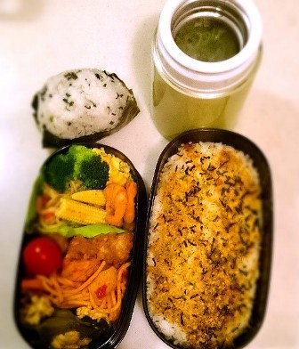 弁当もはや40週目。そろそろ今年度のラストが見えてきたか?月曜弁当 梅干し入り塩握りミックス海藻入り赤だしみそ汁ひじき佃煮+白米肉じゃが(取り置き)焼きビーフン(惣菜)カレーコロッケ(冷凍)2種類のレタスと大根のサラダ(取り置き)+サラダ菜だし巻き卵ミニトマトこの週末、お菓子づくりしていた二人・・・今朝冷蔵庫見たら、卵がぎりぎりしかなくてびっくりっまったくもぉ~~