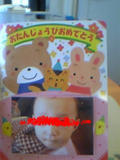 コメントのお返事できなかった原因、分かりました。まずは謝ります。楽天さんのせいにして、ごめんなさい(_ _(--;(_ _(--; ペコペコ犯人は、私でした・・・(;´д`)トホホ。以前に、いやらしい書き込みがあったので、そのドメインを設定してそのドメインからの書き込みを一切禁ずるようにしてたのね。んで、私のアドレスにそのドメイン入ってたの。バカだよね~。設定しなおしたら、コメントできるようになりました(*^-゜)vィェィ♪☆*。。。*☆*。。。*☆*。。。*☆*。。。*☆*。。。*☆さて、先月1歳の誕生日を迎えた我が娘。保育園でも先月お誕生会をしてくれてたらしくて、今日、その誕生日カードを貰いました。写真付です。中身はこんな感じ。ふむふむ・・「おしゃべり上手で笑顔の可愛いさくぼうちゃん(^O^)これからもぐんぐん大きくなあれ♪」ママ、ちょっぴり感動・・そんでそんで、えーっと、「おおきくなったら、"かんごふさん" になりたいです。」へぇー。・・・ってΣ(- -ノ)ノ エェ!? さく、あなた、かんごふさんになりたかったの?!!マミー、ちっとも知らなかったわー注:どうやってなりたい職業が判明したのかは、明日聞くつもりです(笑)。蓮4044