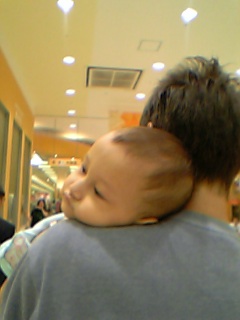 さかのぼって書いています_“〆(б゛б*) 今日は、前回海辺でデートして以来久しぶりのスキッピーさん と、可愛い可愛い男の子ケニー君のママ、ケニママさんに会ってきました♪赤ちゃん連れのお出かけって予想外の事件?があったりするから、早め早めに準備して、出かけたら結構順調で(笑)、あっという間に目的地ここに来ると、絶対行ってしまうのがGAP。夏になると冷房が効きすぎたりするので、ノースリーブのさくぼうには辛いかなぁと思って軽くはおれるカーディガンでも・・と覗いただけだったのに、可愛いGジャン発見思わず手に取ったけど、半そでに丈がこんな短いんじゃ冷房対策にならないじゃん!ってことで断念。ピンクのパーカーみたいな薄手のジャケットと、キャミソールっぽいデザインのベビースーツまで買っちゃったよ(二枚2400円だった・笑)*†*:;;;:*†*:;;;:*†*:;;;:*†*:;;;:*†*:;;;:*†* 久々会ったスキッピーさん、髪が伸びて可愛いお花の髪飾りで横に束ね、キュート初対面のケニママさんも、お目目ぱっちりの可愛らしい女性でしたケニー君にお目目がそっくりだったね~!とっても話しやすいし面白いし、よく笑ってたなぁ(笑)♪恭子さんの『○○を叩きながら~♪』の変な歩き方をみながらウケたり。(ゴメンねスキッピーさん・・( ̄m ̄〃)でも強烈だった・爆)ケニー君とさくぼうは隣同士、見つめあったり手を触りあったりなんだかラブラブモードだったし・・ああ若いってうらやましい(笑)恭子さんはやっぱり可愛くて天真爛漫という言葉が本当にぴったり。注文してからご飯が出てくるまで散々、 『もうーーー恭子早く飲んで食べて~ってしたいのにぃ・・(>_