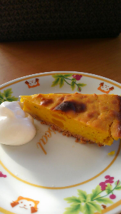 お久しぶりです。 3ヶ月強、短期バイトで過酷な状態でした。 今はまったり。 すっかり季節も冬となり、 南瓜が車庫にごろごろ。 晩ごはんで煮て食べるのにも 限界を感じそうなので タルトにしてみました。 南瓜400グラム、砂糖、生クリーム各50グラム、塩少々、全卵1個 を40分位かけて焼いただけです。 先日、中学校のPTAで研修で教わったレシピです。 簡単だけど、子供っちにも好評でした! また作るべし。