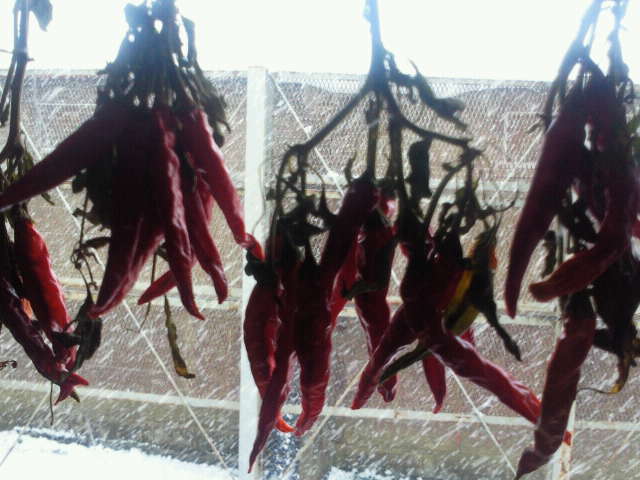 なんてPOPなものじゃありません。一気に始まりました。義母宅の窓より。雪のシロと吊るしている唐辛子のアカのコントラスト。