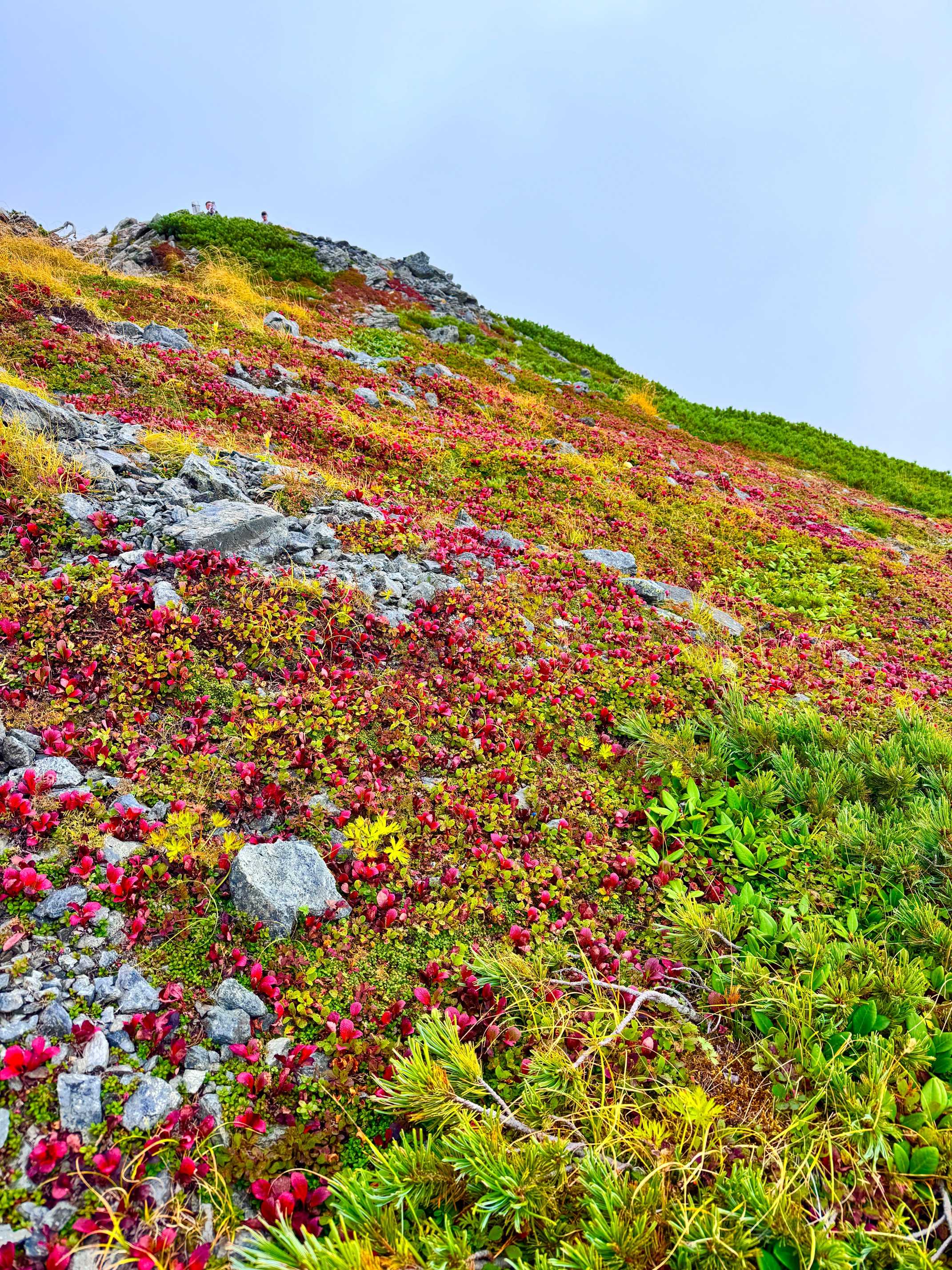 ウラシマツツジ紅葉の稜線へ奈良田駐車場🅿️から広河原登山口⛰️北岳へ9月15日の朝3:00、旦那氏の運転で下諏訪から奈良田へ。前日の14日夕方、倒木による通行止めを北岳肩ノ小屋の掲示で知り、急遽奈良田から広河原へのバスを利用することにしました。旦那氏、早朝から運転ありがと!昔ながらのバス2台狭い道をするすると運転ありがとうです!広河原に降り立つと、森の香りと澄んだ空気に迎えられます。天気予報は晴れだったものの、途中で小雨が。カッパを着るほどではなく、むしろマイナスイオンが立ち込めて瑞々しく気持ちの良い登山道でした🥾✨🍲 白根御池小屋でのご馳走白根御池小屋🛖で大休憩。荷物が重かった理由は、ゆうじ君特製の スタミナ野菜炒め。肉と野菜をたっぷり詰め込んで冷凍し、さらに1リットルの熱湯やガス&コッヘルを担いでいました。そのおかげで、ラーメンに豪快に野菜炒めをのせてぐつぐつ煮込むことができ、山でしか味わえない至福の一杯に。「うまーい!」とお客様の笑顔。その瞬間、ガイド冥利に尽きる幸せを感じました。草すべりと紅葉の稜線草すべりの急登はさすがにきつく、20kg近い荷物がずっしり。それでも 御前橘の赤い実や、真っ赤に色づく ナナカマド に励まされ、一歩一歩。稜線に出ると 小太郎岳が姿を現し、気持ちのいい稜線歩きへ。紅葉真っ只中の浦島ツツジの赤いじゅうたんやホソバイワツメクサの白い花に彩られ、感動しながら進みました。10歩ごとに立ち止まっては景色を眺める——そんな贅沢な時間を経てついに 北岳肩ノ小屋に到着しました。北岳肩ノ小屋の温かいもてなし到着は14時ごろ。小屋の広場からは 仙丈ヶ岳、甲斐駒ヶ岳、そして北岳 の大パノラマ。チェックインすると、懐かしい三代目オーナーが笑顔で迎えてくれました。「毎週のように北岳ツアーをしていた頃の顔を覚えているよ」と。そう、5年前のコロナ前までは、私は毎週ここにお客様をお連れしていたのです。今回はありがたいことに、2人で5人部屋を貸し切りに。コロナ禍でリニューアルされ、見違えるほど綺麗な小屋になっていました。夕食後は外で生ビールをごくごく飲み、他の登山者たちと山談義。夕日も美しく☀️そして夜はショートスリーパーの特権で、22時前に目覚めては満天の星空を独り占め。火球や流れ星🌠もいくつも見えて、まるで宇宙の祝福を受けたようでした。✨ 1日目を振り返って重い荷物も、急登の草すべりも、すべては 「うまい!」の一言や、仲間と分かち合う星空の記憶に変わります。紅葉と再会に彩られたこの日、北岳の稜線は、人生のかけがえのない一ページを刻んでくれました。YouTubeアップしました!