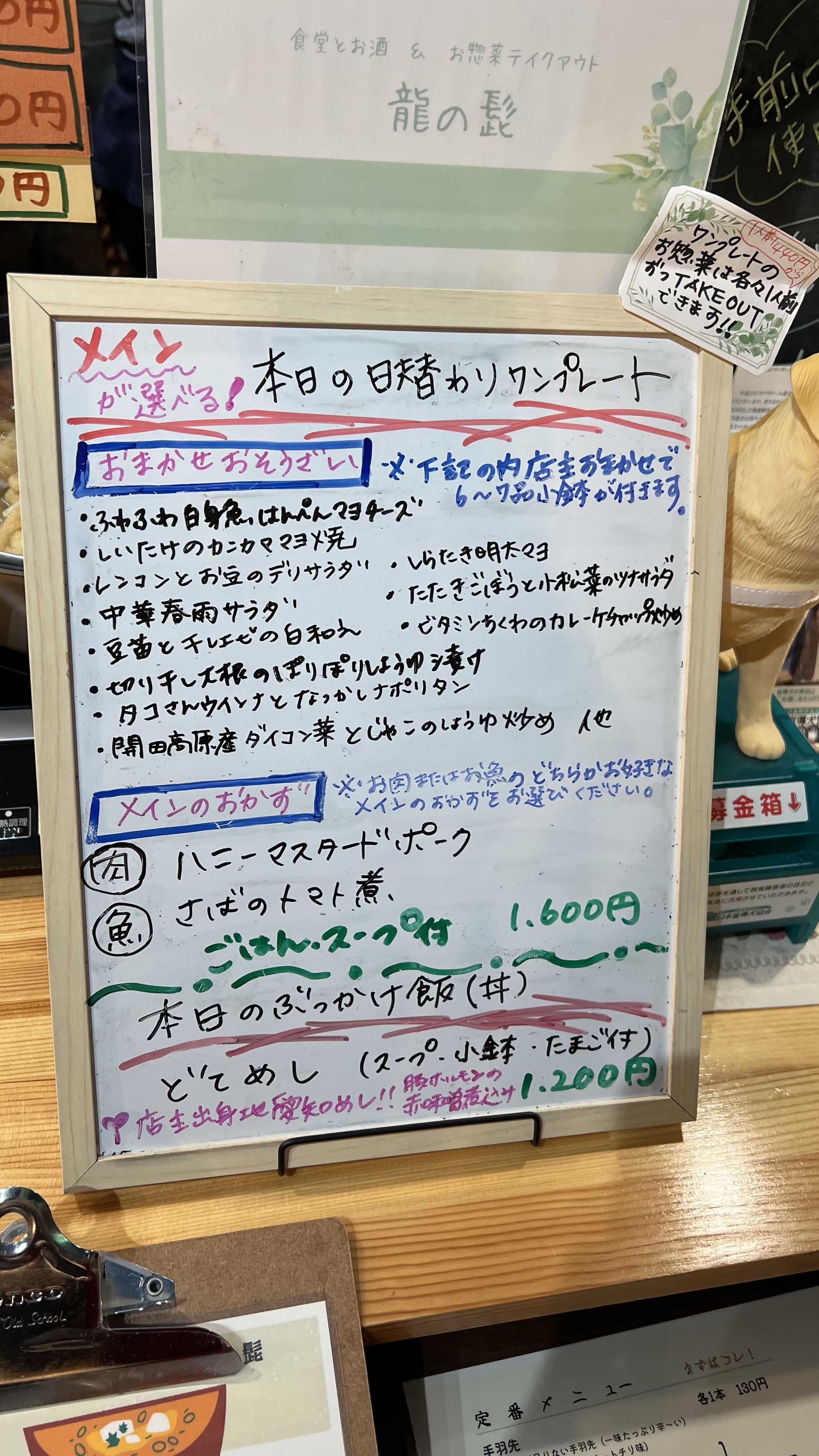 【長野・木曽福島 龍の髭】身体が喜ぶ、愛情たっぷり滋味ごはん人生で一番美味しいクラムチャウダーに出会った夜信州・下道ドライブ旅の途中、どうしても立ち寄りたかったお店があります。長野県木曽郡木曽町福島にある食堂とお惣菜のお店「龍の髭」さん(木曽福島駅すぐ)4日前に電話した時には既に満席。「どうしても食べてみたいのですが」とお願いするとテイクアウトが可能とのことで、注文させて頂きました。店内には、地元の人たちの笑顔が溢れ、丁寧に作られたお惣菜が並び、温かい空気に満ちていました。【おまかせワンプレート定食】この日のメニュー・白身魚とはんぺんマヨチーズ・しいたけのカニカママヨ焼き・レンコンとお豆のデリサラダ・中華春雨サラダ・豆苗と干しエビの白和え・もやしときくらげのピリ辛しょうゆ炒め・タコスパゲッティ・関田市原産 タイコウ菜とじゃこのしょうゆ炒め などメインのおかずは2種類から選択肉:ハニーマスタードポーク魚:さばのトマト煮🍱 おまかせワンプレート定食(テイクアウト)ひとつひとつ手書きで貼られたメニューは、主役も脇役も全部主役級の美味しさ。🥢この日のメニューふわふわ白身魚・はんぺんマヨチーズしいたけのカニカママヨ焼きレンコンとお豆のデリサラダ中華春雨サラダ豆苗と干しエビの白和えもやしときくらげのピリ辛しょうゆ炒めタコスパゲッティとたっぷりオリーブ関田市原産 タイコウ菜とじゃこのしょうゆ炒め などそして…🍖 メインのおかずは2種類から選べる!ハニーマスタードポークさばのトマト煮込み🌾 もち麦ごはんがとにかく最高!香り、食感、旨み、全てが素晴らしい。そして…🥣 伝説級のクラムチャウダー今まで食べてきたクラムチャウダーの中で人生で間違いなく No.1 🌟野菜ゴロゴロ、深い旨味、優しさのしみ込んだ味。まるで身体の細胞1つ1つが喜んでいるかのよう。旦那氏殿も、ひと口食べた瞬間に『うまっ!!何これ!?✨』と大感激。本気で、ここだけのためにまた行きたいレベルです。💛 心と身体が癒される食堂龍の髭さんの料理には“あなたに美味しく食べてほしい” という愛情が詰まっていて、そのエネルギーが全身に広がる感じ。丁寧に選び抜いた素材、地産地消の思い、そして香港薬膳スープの知恵も生きた、食べるほどに元気になれる料理。食堂で食べてもテイクアウトでも幸せのエネルギーは同じ🌿🌕 まとめ「身体に良いものは、心にも喜びをくれる」そんなことを全身で感じた夜でした。また必ず行きます。次は店内でゆっくり味わいたい。龍の髭さん美味しい幸せをありがとうございました✨ 【石田亭ディナーへ続く】帰宅してからの石田亭では、「龍の髭」さんの味が忘れられず、裕二君が早速、再現料理を作ってくれました。白滝と明太子のからしマヨ和え、そして きのこのナムル。シンプルなのに、味わい深くて、「お店の味そのまんまじゃない!?」と思わず顔を見合わせてしまうほどの完成度。旅の余韻を感じながらいただくテーブルは、何より幸せそのものでした。食べるって、愛ですね。