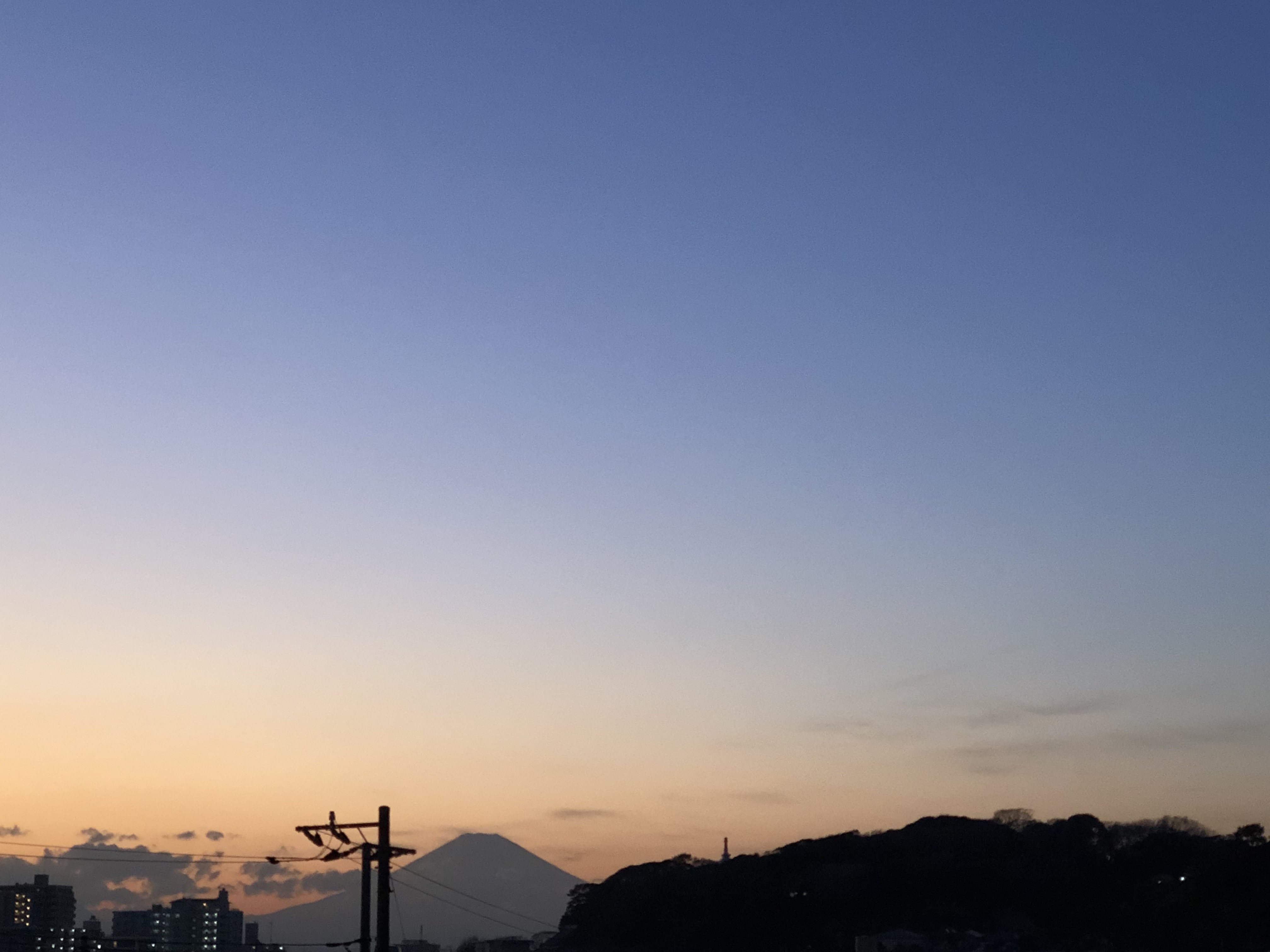 帰宅して我が家のヨガルームから望む富士山は夕陽の中で