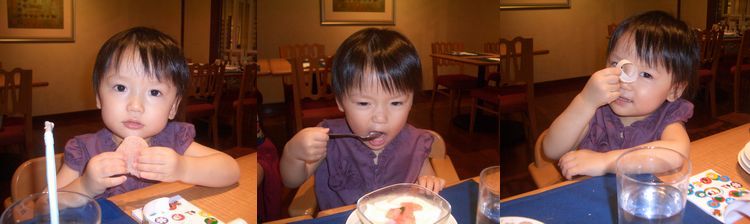 昨日の晩ご飯の外食。おとなしく座ってくれるかなぁと心配だったの。で、持参したのがシール山盛りと小さなメモ帳。集中力が切れたなぁと思ったら、渡してぺったん。あとは、とことんお腹を空かせておく。昼から計画を練ったのよー。まず、ベランダで水遊び1時間。で、そのあとままごと遊びで。。。昼寝もちょぴっと。で、4時からの教育テレビで躍らせて。もちろん、おやつも無し。中華のオーダーバイキング。ばっちり元を取るぞーと、親の気合もばっちし・その効果か、まず食べ物でおとなしくなる~。気に入ったのは、「蒸し鶏」これは一皿丸々食べてくれたわ。で、次は北京ダックについていたえびせん。とりあえず、少しずつ口に放り込んでは反応チェック。ママはその合間に、がっつり♪デザートの杏仁豆腐は半分食べられちゃったし。で、1時間半でタイマーが。。。「おウチで~、パイちゃん♪パーーーイちゃーん♪」(作詞作曲yaya)大声で歌い始めるのよー。周りの人も笑って良いんだか、って感じ。そして、「ごちさまー、かえろ!」って。椅子から降りようとするし。ま、1時間半おとなしくしてくれたのは成功かしら。バイキングは大人二人で27皿。元はとったかな?でももう当分、中華は見たくないなぁ。。。↓ 上品そうな格好をさせたのに、大口です。シールも山盛り貼ってます。