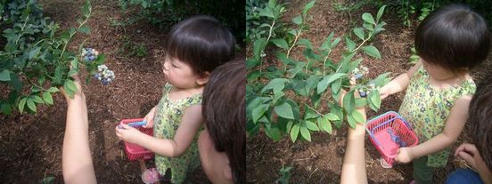 近所でブルーベリー狩りができるとのことなので、お出かけ。朝9時過ぎに農園へ。曇りなんだけど、やっぱり蒸し暑いわ~。我が家はみんな始めてのブルーベリー狩り。ちょっとドキドキ♪ママは「あおいの~、大きいの~、それを取ってね」と。で、誘導し始めたらちゃんと始めてる。未熟なのや小さいのを取るかなと思ったら、ちゃんと選り分けてる~。成長に感動♪この農園のブルーベリーは8月がピーク。まだまだ青くなってないのもたくさん。なんと嬉しいことに、入場無料。摘み取って食べるのも無料。持ち帰りの分だけ、料金を支払うということ。これはお得だわ~。もちろん、予約も必要ないし。娘は食べることよりも、摘み取ることに夢中。ママは結構楽をさせてもらいました。パパちゃんは、孤独に一人摘み歩いてます。どうやら、無になってリフレッシュできるらしい。わかるような気もするわ~。暑さがネックかなぁ。最後のほうは、ぶーたれ娘になってます。というより、暑さでバテたかな?かごの中のベリーは、すべて娘が自力で取ったものです。今日収穫したものは、ほとんどが果実酒用に。初めてブルーベリー酒を作るのだけど、熟成してゴージャスになるらしい。残った少しは、グラニュー糖をまぶして冷凍庫へ。これが美味しいのよ~。アイスなんて、目じゃない!この夏は、ブルーベリー狩りを何度もしちゃいそうです。