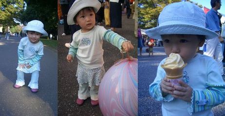 お天気も良いし、今日はちょっと遠出へ。代々木公園まで行ってきました。「ナマステ・インディア2005」というイベントがあったので。原宿駅から代々木公園までお散歩。広々とした公園で、大喜びで歩き回ってます。カメラを向けると、ポーズと静止。が、なんだかやっぱりへんてこポーズだよなぁ。会場に到着したら、まずは食べ物コーナーへ。いろんなお店のものを食べ歩いてました。感想は、うーん、ちょっと辛すぎ&しつこい感じ。おもしろいなぁと思ったのが、レストランではなく踊りの団体で食パンに衣をつけて揚げて、それに辛いソースをつけて食べる。味もシンプルでとっても気に入りました。自分バージョンで作ってみようかなと。家庭料理がおいしいなぁと思う、今日この頃。かっらーいインド天ぷらを娘に一口。いきなり舌を「べーーーー」と出して、くしゃくしゃな顔。よっぽど辛かったのか、「かっらーいいいいーーーー」と言ってました。お詫びにマンゴアイスーを持たせたら、すごい勢いで。(笑)他のお店では懐かしの「パンチボール」を売っていて、それが一番のお気に入りのようで遊んでいました。が、持って帰るのに難儀したわ~。夕方までここで過ごして、このあとは新宿へ。ハンズと高島屋でうろうろ~。晩ご飯はディンタイフォンでショーロンポー。しばらくぶりで、大満足。待ち時間も30分だったので、まあまあってところかな。娘も麺とショーロンポーを二つほど食べてました。よっぽど美味しかったのかショーロンポーを指差して、「もっと~」って。で、おウチへ。しかし、この夜が大変。親は二人とも、疲れてへとへと~。が、娘は興奮してるのか妙に元気だし。長い夜の始まりでした。。。とほほ。