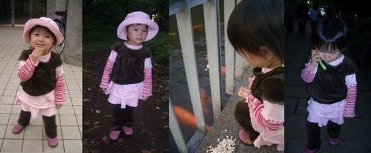 せっかくのお天気。でも、ママの体調がちぴっと悪かったので、お昼まではおウチでゴロゴロ。起きて、ご飯を食べて気力十分。でも、午後3時の出発なんだよね。ダメママだわ~、とほほ。たっぷり散歩をしないともったいないわとお出かけ。疲れさせるためには、歩かせるしかないわ~と。結局公園で1時間半のお散歩。池でみんなコイや鳥にエサをあげてる。それを見ていてはしゃぐ娘。なぜか、いろんな人からエサをもらってあげてます。次回は売店で買ってから行かなきゃかなぁ。。。そういえば、添乗員をやっていた頃のアタシ。よくお客さんからお菓子やら飲み物をもらっていたんだよねー。そういう顔をしているのかしら。。。ときどきチップをもらったりしたら、ラッキーって思っていたよ。でも、お菓子率が一番高かったなぁ。それが娘にも遺伝してるのかしら。(笑)途中で携帯に電話がかかってきたら娘が話す~と。渡したら、大人とおんなじ格好でしゃべってる。よく観察してるなぁ。このあともデパートをハシゴして、閉店時間まで遊び続けていた娘。毎日は付き合いきれないよー。早く幼稚園に行ってくれ~。