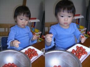 今日の晩ご飯は二人なので、あっさりほかほかミネストローネ。というのも、アタシは今日はアーユルヴェーダの治療の日。前後は出来るだけ軽いものと言われているので。今日のミネストローネの具は、たまねぎ、セロリ、カブ、にんじん、じゃがいもと緑豆&レンズ豆。そしてミニトマト。パスタは入れずに。娘にも食べてもらおうと思って、全部小さく切りました。で、セロリとたまねぎを少量のオリーブ油で透き通るまで炒めて残りの野菜を投入して水を加えて似るだけ。ミニトマトのヘタを取っていたら、娘が「yayaちゃんもー」と。で、一緒にやってみた。一つ目は力の加減がわからないのか苦労していたけれど、二つ目から快調、快調~。で、結局全部ヘタを取ってもらいました。やったー、ママの野望「家事の戦力化」への第一歩だわ~。遊びにしてあげると、やってくれるんだろうなぁ。数個はつぶれてしまったけれど、煮てしまうからいいや。鍋に入れて混ぜていると、「yayaちゃんも、まぜまぜ、したーーーい」というので、抱っこして混ぜ棒を持たせたらフリーズ。実は前に同じことをして、鍋に触れてしまって熱い思いをしたのよね。(やけどにはならなかったのでセーフ)学習してるんだなぁって、面白くなっちゃった。で、ご飯も二人で。珍しく、野菜をお茶碗2杯も食べてくれた。あ、今日は朝9時半から2時までスクール。そしてその後スイミングだったから、お腹も空いていたのかしら。朝はご機嫌。テレタビーズを見るというのでちょっとだけ遅刻。最近は野菜を嫌がるので、どうやって食べさせるかの知恵比べ。昨日は、シラスとかぶみぞれ雑炊だしなぁ。毎日研究だわ。
