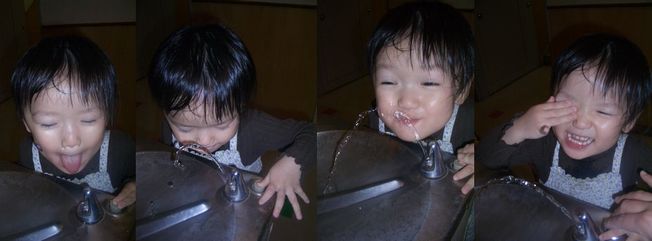 今日は久しぶりにプールへ。娘の風邪や寒いから外出はやめようというヘタレ気分で、2週間くらいぶりかなぁ。その間は、お風呂の中で大特訓?お風呂大好き娘、ママのほうが先にのぼせてしまうのでパパに途中でタッチです。パパに入れてもらっても、ママが入るタイミングに再び服をヌギヌギ。たまには一人でお風呂に入りたいなぁ。。。湯船でキックの練習をしたりしていたせいか、今日はサマになった泳ぎ方をしていました。寒さに負けずに連れて行ってあげなくっちゃ。そのあとに帰ろうとしたら、幼稚園児のおねえちゃんが水を飲もうとしているのを発見!あーあ、見つかっちゃったよ。。。で「おみず、のみたいのーーーーーー」。仕方が無いので台に乗せて。しかも、自分でボタンは押したいらしい。もちろんなかなか強弱とタイミングが合いません。あまりに面白い顔をたくさんしてくれたのでカメラでパチリ。水の放物線がキレイだなぁと思った。手と目とすべてにバランスをとらないと、こうやって飲むのも大変なのねーと思っちゃいました。