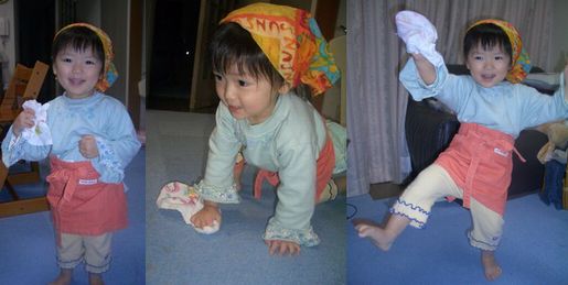 どうやら親のすること、なんでもまねっこの時期のよう。夫婦で掃除をしていたら、「yayaちゃんも、おそうじしたいのーーー♪」。そして、「エプロンしたいのー」とタオルを取りに行って自分の腰に巻きつけようとするのでちゃんとエプロンを巻いてあげました。おまけにママの昔のスカーフを三角巾にしました。とーってもご満悦なお嬢さん。キティちゃんのタオルでじゅうたんを拭き掃除(のマネッコ)かなり気合が入っています。終わったら、「できたーー♪」とおたけび。そしてお気に入りのポーズで〆てました。子どもってなんでも遊びにできるんだなぁ。これ以外にも洗った食器を拭いてしまったり。洗濯物をたたんでいると、しまったりしてくれてます。ダメママだから、子どもが成長してくれてるみたい。
