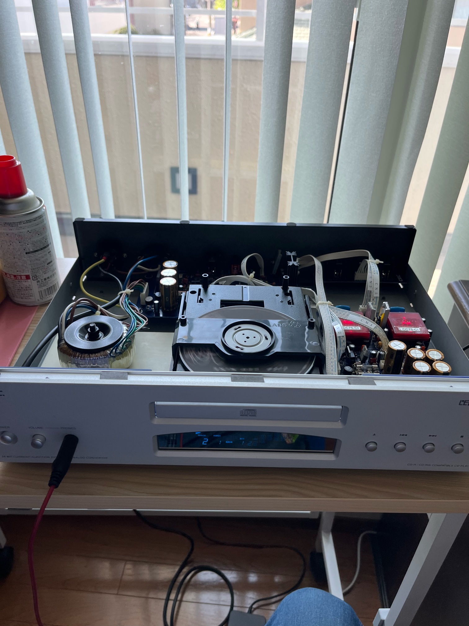 XLR入力専用ヘッドホンアンプを使って、バランス接続でのテストをしてみようと、我が家にある唯一のXLR出力を待つ音響機器「CEC CD3300R」を引っ張り出して来た。外の物置に5年以上?放置してあった。いざ、再生しようとすると、CDトレイが出て来ない。開閉扉駆動用のゴムベルトが、伸びて固まっていた。仕方がないので、サイズの合いそうなゴムベルトを通販で注文、1本欲しいだけなのに、サイズ違いの物を含めていっぱい届いた。交換して無事にトレイは動くし、再生はしているようなんだが、音が出ない?オーディオボードのLEDが付いていない?仕方が無いから、調べるかと思い基板を外し、先ずはヒューズから!最初にテスターをあてたヒューズに導通が無い?見た目では、ヒューズが飛んだ様に見えない。溶断したヒューズの見た目では無い。取り外してみると、フラフラとヒューズが揺れる。1番端の方で断線している。このサイズのヒューズに手持ちが無いので、ヒューズを分解して引き伸ばしてヒューズホルダーに巻き付けてみた。電源を入れると見事に復活しました。会社にこのサイズのヒューズあるから今度持って来よう。【ふるさと納税】DENON CDプレーヤー [DCD900NE] デノン サウンド 音響機器 オーディオ F21R-829CD-S303 [B:ブラック] YAMAHA [ヤマハ] CDプレーヤーCD-S303 YAMAHA [ヤマハ] CDプレーヤー