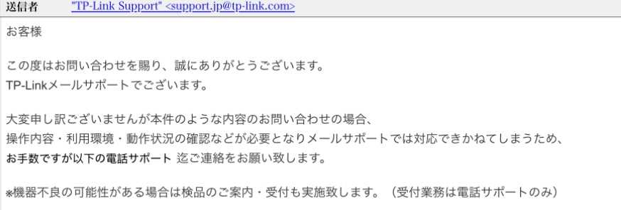 先日購入して利用しているTp-linkのルーターだが、システムログを見ると不思議な動きをしていた。具体的には、IPアドレスをDHCPサーバーから取得するのだが、数秒から数十秒に一回、renewingが発生している。DHCPサーバーでリースタイムの設定を、変更しても何ら変化は無く、IPアドレスの管理がバグってるなではないかと問い合わせをしてみた。そして得た回答が冒頭のキャプチャーである。何だろう?事前に用意してある回答集からの回答以外は回答出来ない的な内容にビックリ!こう言う類の回答は珍しくないか?「ログを技術の方へ送って回答をしますので、時間がかかります」とか、「技術へエスカレーションしますので設定情報も送って下さい」とかの回答が普通だろう。電話サポートとなんて、より低レベルなサポートとしか期待出来ない。「わかんないから電話サポートへ回したれ!」と言う意思が見えるのだが?電話サポートに連絡すれば、散々話した挙句に、機器の不良かもしれませんから、「代替え機を送ります。」になるのだろう。どうしたもんだか、、、、今も大量のDHCPトラヒックがネットワークを流れているかと思うと気持ち悪いが、我慢して利用しよう。