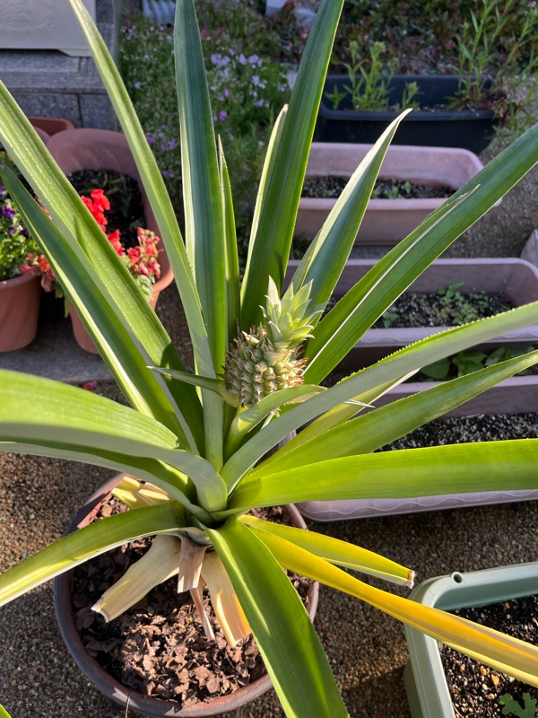 スーパーで買ったパイナップルのクラウンを植えて育てる事をリボベジ?と言うらしい。パイナップルだけでは無く、植物を再生栽培する事を指す言葉なのかもしれない。家でも、パイナップルのリボベジに挑戦している。植えてから、もう7年ぐらい経つが、一向に花が咲く気配が無かった。やっぱり気候的に難しいのかと思っていたが、アセチレンガスにさらすことで、花芽が付くと言う記事を見て、真似てみた。アセチレンガスのために、カーバイドをかざしたが、もう何処にも売って居ない。ネットでも、高価な商品で殆ど絶滅状態。釣りの人もカーバイドランプなんて使わない時代なんだろね。リチウムイオン電池とLEDがそれにとって変わったんだろう。仕方がないから、ネットの記事と同様にリンゴを鉢の側に置いたり、剥いた皮を鉢の中に置いたり、バナナの皮を置いたりしたところ、上の写真の様に、花芽がつきました。今年は、自家製パイナップルが食べられるかもしれない。暖かくなって外に出せば大きく育ってくれるだろうか?楽しみ楽しみ!【ふるさと納税】 【2025年6~8月頃配送】今帰仁産パインアップル(ゴールドバレル)1.8kg 1~2玉【ふるさと納税】【先行予約】【訳あり】 石垣島産 パイナップル 約4kg 4~10個 《2025年5月から順次発送いたします》| ふるさと納税 パイナップル パイン フルーツ 果物 果実 南国フルーツ 訳あり 沖縄県 石垣市 石垣島 産地直送 ふるさと 人気 送料無料 KP-15
