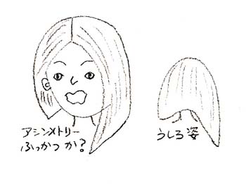 久しぶりに美容師ネルダちゃんのところに予約を入れて、ヘアカットに行ってきた。前回は12月の初めだったので、ほぼ3ヶ月ぶりだ。もう髪が伸び放題だ。さて、予約時間通りに行ったら、お客は私1人だった。シャンプーした後、いつもどおり「今日はどうする?」と聞く。私はこの前と同じでいいと思ったので、「伸びた分だけ切って。 前回と同じでいいから。」と答えた。すると、ネルダちゃんはいきなり思いついたようにこう言った。「ね、このモデルを見て。月曜日、講習会があって、そこで習ったカットなの。素敵でしょう? にきーたのストレートな髪にピッタリだと思うわ。サイドの髪も伸びているから、丁度いい。どう? 試してみない?」ネルダちゃんが見せてくれた、見本のマネキンの頭は、いわゆるアシンメトリカットで、片方が長く、片方が短いというものだ。こんなの、高校生の時流行ったスタイルだ。また流行るんだろうか。 流行ったってそんな髪型にしたくない。私は今やってる、普通のワンレンでいい。というわけで、ネルダちゃんにそう言った。すると、なんとネルダちゃんは粘る。「そうね、後ろが短くなってるし、左右の長さが極端だもんね。でも、でもね、後ろは切り過ぎないで、左右もあまり差をつけないカットにしてみない?」と、このスタイルに似たものを勧める。結局、ちょっと今のスタイルと変えてみるのもいいかと、極端にはしないことという条件付で妥協する。髪をカットされながら思ったのだが、ネルダちゃんは、私のような直毛をカットするチャンスがなかなかないので、今回はそのチャンスを利用したかったのではないか20分も経たないうちに、カット終了。早速スタイリングにかかるのだが、「素敵だわ~~、Bellissima(ベリッシマ)~~」と自分のカットの出来具合に感動しているようだった。私としても、なかなか良くカットできているし、まっすぐな髪がきれいに流れるようにセットされている。何よりもスッキリしたので、満足だ。そのマネキンのモデルの写真を撮りたかったが、さすがの私も、許可を得る勇気がでなかった。しかしながら、こんな説明だけだったら皆さんを困惑させるだけだろう。というわけで、子供だましのようなお絵かきをしてみた。 これはネルダちゃんがしたかったカット。 こんな風に左右が極端だ。 ↑後姿だって、きのこっぽい。というわけで、大事に至らず、今回もヘアカット終了。28ユーロなり。ネルダちゃんは27歳と若いので、毎回行くたびに違うスタイルを提供してくれる。いい時もあるし、今回のように困ってしまうこともある。しかし、マンネリ防止にはいいのかもしれない。ネルダちゃんはこんな感じよ