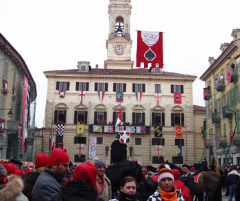 北イタリアのピエモンテ州の北部に、Ivrea(イヴレア)という人口24000人の市がある。ここで開かれるカーニバルはとても異色だ。オレンジの投げ合い合戦(?)をするのだ。1808年から続いていて、今年は200年目である。日曜日、このオレンジ合戦が見物出来るという事で悪天候の中、私達は出かけた。中心街に近ずくにつれて、渋滞に巻き込まれた。 天気が悪いにもかかわらず、どんどん人が集まってくる。観光バスも何台か見える。路上ではケースに入ったオレンジや、カーニバルの小道具である 赤い帽子が売られている。私達にとって、このカーニバルは2回目だ。前回は確か7年前くらいだったと思う。私はムニャイア(粉屋の娘)の長ひょろい帽子、夫は以前買ったベースボールキャップが見つからず、赤いマフラーを持参する。この赤い帽子、イヴレアのカーニバルでは必需品なのである。旧市街についたのだが、ここから先は6ユーロの入場料がかかった。7年前は無料だったので、ちょっとショック。 どこを見ても赤い帽子だらけパレード、そしてオレンジ合戦は昼2時15分からということで、それまで軽食を取ったり、街の中を歩いて回る。小雨が時々降って、気温が2℃というのが哀しい。 イヴレアの街並み 街の店先も、オレンジや合戦をするチームのカザッカと呼ばれる衣装で飾られている。1時半を過ぎると、路上を吹奏楽のパレードが行進する。祭り気分が盛り上がる。 路上には、オレンジ合戦のチームのカザッカを着た若者達が集まってきた。この画像を見ると、店の前がナイロンの布で覆われていたり、左側の店の前にはグリーンのネットがかけられているのが見える。 これはオレンジ合戦の被害に遭わないようにという下準備だ。オレンジ合戦のチームは9つあるようだ。昔、イヴレアが村であった頃、小さな村落に分かれていた。その村落にはそれぞれ名前があって、ある意味でライバル意識を持っていた。オレンジ合戦のチームは、この村落に分かれているようだ。さて、このカザッカであるが、背中にはガイコツやスペード、さそりのマークなど、いろいろなデザインがある。とてもカラフルで、ひと目でどのチームをひいきにしているかもわかる。太鼓の音が聞こえてきた。いよいよパレードの始まりである。ドキドキしながら、市役所のある広場へ向かうことにする。 続きは次回