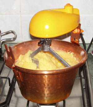 ポレンタという食べ物がある。イタリアの特に北部で食べる、いわゆる Cucina poveraクチーナ・ポーベラ(安い材料を使った料理)である。ポレンタはとうもろこしを粉にして、それに水、塩、少し牛乳も加えて煮込んだ物である。昔、パンが食べれなかった貧農は、とうもろこしの粉を調理して、空腹を満たしていたのだろう。そんな貧農用の食べ物が見直されつつある。そしてそれが一般人にウケて(?)好まれている。我が家では、冬になるとポレンタが食べたくなる。早い年は9月下旬、または10月に第1回目のポレンタを作る。ポレンタの粉は、スーパーで売っている。1キロあたりだいたい2ユーロくらいだ。我が家では、大体500gを一回分として、銅製の鍋に水を約2リットル入れ、塩、牛乳を加える。そしてぬるま湯くらいになったところで、粉を少しずつ入れて混ぜる。 ぐるぐる回って一人で混ぜてくれる実はこの混ぜるのが面倒である。というのも、ポレンタが出来上がるまでに、最低30分から40分くらいかかるのだが、始終近くにいて水を加えたり、混ぜたりしなくてはいけないからだ。我が家では、過去に2度ポレンタを作って、「もうこんなの面倒!!」と私がサジを投げてしまった。夫も40分も火の側で混ぜ混ぜするのはごめんだと言いしばらくポレンタを食べない時期があった。しかし、初秋のちょっと寒くなった日の夕方はポレンタが食べたくなる。そこで上の画像にある、「Paiolo」パイオロ(銅製の鍋)を金物屋で見つけて購入したのだ。この鍋の良いところは、電力で自分で混ぜてくれる事だ。側で見張っていなくてはいけないが、わずらわしい40分の混ぜ混ぜ拷問からは開放される。ちなみにこの鍋は、自家製ジャムを作る時にも使えるということ。さて、ポレンタが出来上がる。いろんな食べ方があるのだが、我が家ではソーセージのトマトソースを作っておいて、これをかけて食べるのが定番だ。青カビの、匂いがきついゴルゴンゾーラというチーズを混ぜたり、バターを乗せて食べたりと、いろいろ試したがトマトソースが一番気に入っている。 巷にはインスタントに出来るポレンタの粉も売っている。お湯に混ぜて5分で出来上がりという便利物だが、どうも味気ない。夫は「こんなのまずい。」と食べない。職場でポレンタの話題になった時、農家に住む同僚までが「うちではインスタントよ。 だって、面倒だし味だって同じ。」と言うのには驚いた。ポレンタのような、昔ながらの郷土料理は手抜きはしないんだろうな~と思っていたのだ。我が家ではこのパイオロを使って、これからまた何年も時間をかけてポレンタを作るだろう。とても便利な鍋を見つけることが出来てよかった。ただ1つ残念なのは、この鍋、ご覧のとおり銅製で、鍋にポレンタがくっついてしまうことだ。食事の後、鍋を洗うのが面倒なのだ。もしテフロン製の鍋ができれば、それに乗り換えてもいいかなと密かに思うのだが、何となく味気ない感じがしないでもない。