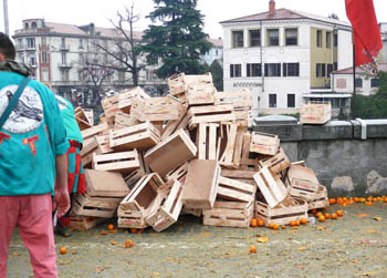 パレードが始まるというので、私達は市役所のある広場へ移動した。 かなり人が集まっている。市役所の前には将軍と、ムニャイア(粉ひき屋の娘)を乗せた金色の馬車、そしてパレードが始まった。 どうしてカーニバルに、ムニャイア?と思われる方もいらっしゃるだろう。手元にある資料によると、今から700年ほど前、イヴレアにヴィオレッタという美しい娘がいた。この地を支配する封建領主、モンフェルラート侯爵グリエルモ8世は、彼女に思いを寄せていたが、粉ひき屋の娘であったヴィオレッタはトニョットという青年と結婚することになった。ところが貧しい2人は婚姻税が払えない。そこでヴィオレッタは拉致され、侯爵の城館で代価を払わされることになった。彼女はこれを受け入れるふりをし、領主の寝室まで付き従って行ったが、突然白い衣装の下から、隠し持っていたナイフを取り出し、暴君の首をはねた。これに続いてイヴレアに暴動が起き、暴君の城はたちまち壊された。この話は真実か逸話かはわからないのだが、ヴィオレッタ=ムニャイアは「真善美」でカーニバルの主役である。ムニャイアは馬車の上からキャンディやミモザを周りの人たちに投げ、広場を出て行った。さて、オレンジ合戦の始まりである。広場にはあらかじめ、オレンジを入れたケースが山積みしてあった。 右側に馬のおしりも入ってしまった・・・旧市街の5ヶ所でオレンジ合戦が行われるのだが、この日だけで3,5トンのオレンジを消費するという。広場は殺気立ってくる。横では男2人が頭を前に出して、他の男達が頭をめがけてオレンジを投げつけるという、荒々しいウォーミング・アップも行われている。観客は急いでネットに囲まれた安全地帯に非難し、合戦が始まるのを待っている。最初の荷台が入ってきた。中には10人くらいの男達。一斉に荷台の男達からも、広場で待っていた男女からもオレンジが投げられる。 荷台の男達は、顔と頭にはヘルメットをつけ、上半身にはフットボールの選手のようなプロテクターを身に着けている。ところが、下で投げている男女は、カザッカを着ているだけ。プロテクションは一切なしである。荷台は広場をぐるりと一回りする。 馬2頭立てで荷台を操る2人の男達と、馬にはオレンジを投げてはいけないと決まっているようだが、あてにはならない。ヘルメットを付けているいる者もいれば、つけずに頑張るツワモノもいる。 このように、広場には次から次へと荷台が入ってくる。1つ荷台が出ると、男達は隅に置いてあるオレンジのケースに行き、オレンジをポケットに入れたり、ショルダーバッグに入れたりして次の荷台を待つ。 プーンとオレンジの香りが漂う。広場はつぶれたオレンジでグチャグチャになっている。オレンジ合戦とは、一体何を意味するのだろうか?説明によると、荷台に乗った男達は、領主などのパワーを持った人たち。そして下からオレンジを投げつけるのは、それに反抗する民衆を意味しているという。中世の時代には豆や紙吹雪を投げていたというが、いつからかオレンジに変わった。さて、私達はネットの後ろで一応安全だ。しかしながら、時々目の前にオレンジが飛んできて、身をすくめてしまう。ネットに引っかかって、私達に直撃はしないのだが、何度もビクッとする。気が付くと、着ているジャンパーの前あたりにオレンジの汁が飛んでいた。夫の肩には、知らぬ間に果肉がついていた。怖いような、うれしいような、何とも言い表せない状態で1時間くらい経過。私達はちょっと疲れてしまって、コーヒーでも飲んでちょっと休もうかと、場所を変えることにした。 また続く・・・・