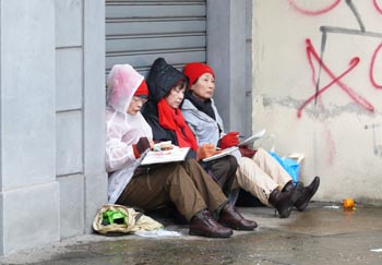 数週間前 Ivrea(イヴレア)のオレンジ合戦のカーニバルに行った時、辺りはオレンジでグチャグチャで、騒然としている中ふと気が付くと、アジア人のご婦人達が街の片隅で写生をしているのが見えた。 ムニャイアの赤い帽子をかぶって、小雨をよけるいでたちで3人でそれぞれ水彩画に熱中しているようだった。人がせわしなく行きかう中、完全に自分達の世界を持って写生を楽しんでいる姿が、ほのぼのとしてうれしくなってしまった。行きかう人々も足を止めて見ていたので、やっぱり気になるのだろう。夫は「日本人だな。」と何故か確信を持って、変に親しみをこめて写真を撮ってしまった。私は「なんで日本人ってわかるの?」と同じアジア系の人たちにカメラを向けるのは何となく居心地が悪く、そのまま。「ほら、札幌でも京都でも、お寺や公園に行くとあの年代の人達が写生していたじゃない。」と過去の記憶から、無理やり日本人と決め付けているのだが、はたしてご婦人方の居た場所は丁度橋に近い所で、多分塔やオレンジ合戦の様子が見えたのだと思う。 すばらしい絵が描けましたように。