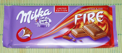 ちょっと前に味見してみた、ミルカのスイカ味チョコレート。これと一緒に 「チリ風味」 のチョコもある。昨日買い物に出かけた時、スイカ味を探したのだが、既に売り切れ。仕方ないので、ちょっと不安だが 「チリ風味」 を試す事にする。 スイカ味が 「Water」 で、チリ味は 「Fire」 っていうところが・・・・チリ風味のチョコレートは、決して珍しくない。店頭にはありとあらゆるメーカーの、チリ風味チョコレートが売りに出されている。チョコレートが好きな私だが、いつも買うのは 「甘系」でスパイシーなのは敬遠していた。さて、味見。ひと口サイズ、パキっと割って食べてみる。ブラックチョコレートの替わりに、外はミルクチョコレート、そして中にカカオ風味が入っている(様な気がする。)どんなに辛いんだろう・・・と心配したのがウソのよう。ゴクリと飲み込んだ後に、じんわりと薄辛い味がする。なーんだ、平気じゃん。とまたひと口。そしてまたひと口。ああ、おいしい。それから10分くらい経過しただろうか。歯を磨きに洗面所に行く。歯を磨き始める。口の中がミントの香りで一杯になる。・・・・・そして忘れかけていたチリペッパーの味が口中の広がる。どうして??!!どうやら香辛料は、歯と歯の間に滑り込んで隠れていたようだ。食べ終わってしばらくした後、口の中は辛くなり、結局この辛さを取るため、歯を2度磨く事になってしまった。リピートは・・・・ないな・・・・