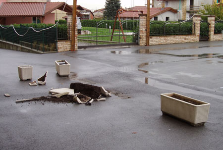 今朝起こった事。11時前に郵便配達の車の音が聞こえ、その後何かにぶつかる音が聞こえた。それも2回・・・・・ちょうどキッチンにいた私は、バルコニーに出てみる。なんと郵便屋が私の住むマンションの入り口に置いてあるプランターに車をぶつけたらしい。 入り口付近に、「駐車禁止用」 として置かれているプランター。今年の7月、雹が降った時、植えてあったものが全滅し、その後植物を取り除いてそのままになっていた。多分来年の春にまた何か植える予定だったんだろう。外で何かがぶつかる音がした時、すぐに出て行ったので、ぶつけたのが郵便車だと私は目撃したのだが、運転していたのはマリンおじさんではない。マリンおじさんは10月末に長年同居していたアルジェリア人の女性と結婚し、今新婚旅行中だからだ。この2週間、見たことのない若造が配達していたようだった。そのあと10分も経たないうちに、郵便車がもう1台の郵便車をともなって戻ってきた。雨の降る中、事情を説明しているようだった。多分後でマンションの管理人に相談に行くんだろう。私は郵便車2台が去った後、早速外に出てデジカメ撮影をしたのだった。ブログやってなかったら、デジカメ持って外には出てないだろうな~~と心の中で思い、にやり としてしまった。