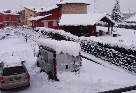 先週から北イタリアにまた寒波がきているようだ。イタオヤの入院中、朝晩と寒いとは思ったけれど、気温がどのくらいなのかわからなかった。金曜日は朝から霧が立ちこめ、朝の気温は-8℃。日中も-4℃までしか上がらず、道路は凍結してしまうし木々は霜で真っ白になるしで本当に寒い思いをした。 近所の様子。 郵便局前にある、ザクロの木。枝に氷がはりついて、とてもきれい。私達は冬場でもキッチン内の換気もかねて、よく窓を開ける事がある。キッチンにはバルコニーに直接出る大きなドアがあり、開け閉めのできる網戸もついている。 塩を盛ったんじゃありません。画像からだと見えないかもしれないが、霧がこの気温で網戸に凍りつき、網戸を開けると塩のようにサラサラと網戸から落ちた様子。金曜、土曜、日曜と毎朝-8~9℃だったが、今日月曜日、どうにか気温が上がって-3℃だった。この週末、しばれる外を見ながら、「病院から退院するのが、こんなに寒くて霧のある日じゃなくてよかったね・・・・」と私達は何度も言い合ったのだった。