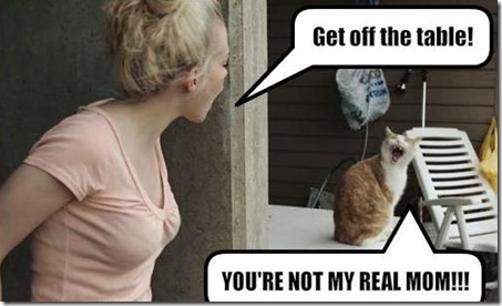 最近天気予報が面白いくらいはずれている。例えば12月31日から元旦にかけて雪が降るはずだったのに元旦に小雨が2時間くらい降っただけ。そしてその後晴れた。2日も曇りのハズだった。しかし朝から雲ひとつない真っ青な空。気温も朝の10時には8℃まであがり、もしかしたら春っぽい陽気になるかも・・・なんて期待もした。こんな日は午後からもちろん田舎道の散歩に出かけたい。そう思ってランチを食べていたら、やけに風が出てきた。干してあった洗濯物がハタハタと飛んでいきそうなくらいの強風になってきた。そして8℃以上あった気温も、5℃に下がる。「こんな強風の日はやっぱり田舎の散歩はやめておいた方がいいな。」そう決めて街にでかけたのだが、寒いのなんのって・・・しかし曇る様子もない。強風で雲が流れてきて、それも吹き飛ばされたようだった。曇るはずがこんな天気になったので、明日の予報はどうなんだ・・・とやっぱり気になる。えっ?明日の朝7時、気温は-10℃だって???!!!うそだろう~~~これもはずれて欲しい~~~さて、こんなん見つけました 女性: 「テーブルからおリなさい!!」ネコさん: 「ふん、あたちの本当のかーちゃんじゃないでしょっ!!」困っちゃうわね~~~