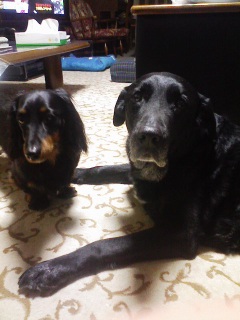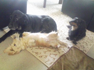 なな「ねえ、ブクタン。」 「ちょっとこっち見てくだしゃい」 ブクと大地はお仕事に行く準備中の父を目で追い。 ななちゃんはブクにアピール中。 しかし、なぜラブラドールと並んでるのに、 小さく見えないんだい?ななちゃんは。