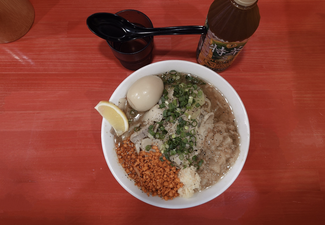 🕋ラーメン鷹の目 獨協大学前本店〒340-0011埼玉県草加市栄町2-9-12🐷ネギ塩豚ラーメン(限定)(3→2)🗣️全マシ麺の量は300g。→50gずつ、減らす事ができる。麺マシは「100円券」を購入→400g〜店員に申告限定はネギ塩豚ラーメン、ネギ塩豚まぜそばの二刀流ラーメンは【限定2】、まぜそばは【限定3】で🆗😋↑ネギ塩豚ラーメン+味玉鷹の目酒場のにゅうめんのような塩味と思いきやガツンとくる塩味、玉子につけると美味いかも😋デフォルトトッピングネギ(青葱、白葱)、豚、ブラックペッパー、味玉無料トッピングニンニク、アブラ、辛揚げ、レモンす有料トッピング味玉↑※豚はデフォルトで入っていないので豚マシの購入をしないといけない⚠️店頭の自販機で購入したものは店内に持込🆗サントリー特茶、黒烏龍茶などもあります🍵↑建物外観最後まで読んでいただき、ありがとうございました。ラーメン鷹の目 4月 限定一覧🦅ラーメン鷹の目 蒲田店 🇹🇼台湾まぜそば〒144-0051東京都大田区西蒲田8-2-1🦅ラーメン鷹の目 川口店🧈エビバターラーメン〒332-0017埼玉県川口市栄町3-8-8🦅ラーメン鷹の目 大宮店🧈明太バターまぜそば〒330-0846埼玉県さいたま市大宮区大門町1-12-13🦅ラーメン鷹の目 北千住店🐣ぺぺたま〒120-0034東京都足立区千住2-29🦅ラーメン鷹の目 明大前店🧈明太バターまぜそば〒156-0043東京都世田谷区松原2-45-2🦅ラーメン鷹の目 西巣鴨店🥒ニラまぜそば〒170-0001東京都豊島区西巣鴨3-19-9🦅ラーメン鷹の目 東陽町店🧈明太バターまぜそば〒136-0076東京都江東区南砂2-1-2 #ラーメン鷹の目#鷹の目#獨協大学前本店#本店#二郎系#二郎系インスパイア#自家製麺#限定#4月限定#ネギ塩豚ラーメン#ねぎ塩豚ラーメン#獨協大学#獨協大学前#松原団地#草加松原