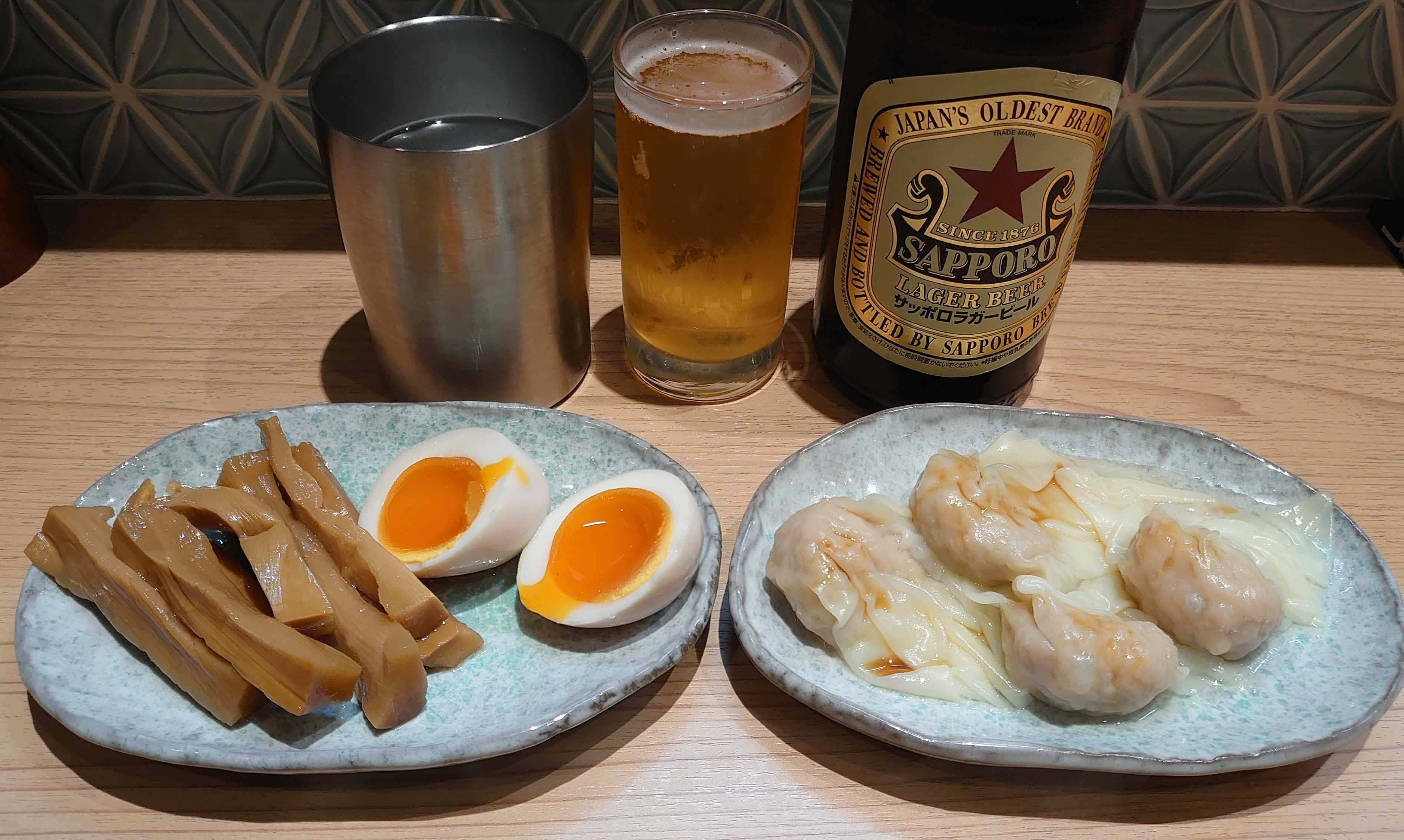 🥚味玉+ワンタン×2+極太メンマ×2🍺赤星+レモンサワー🍋