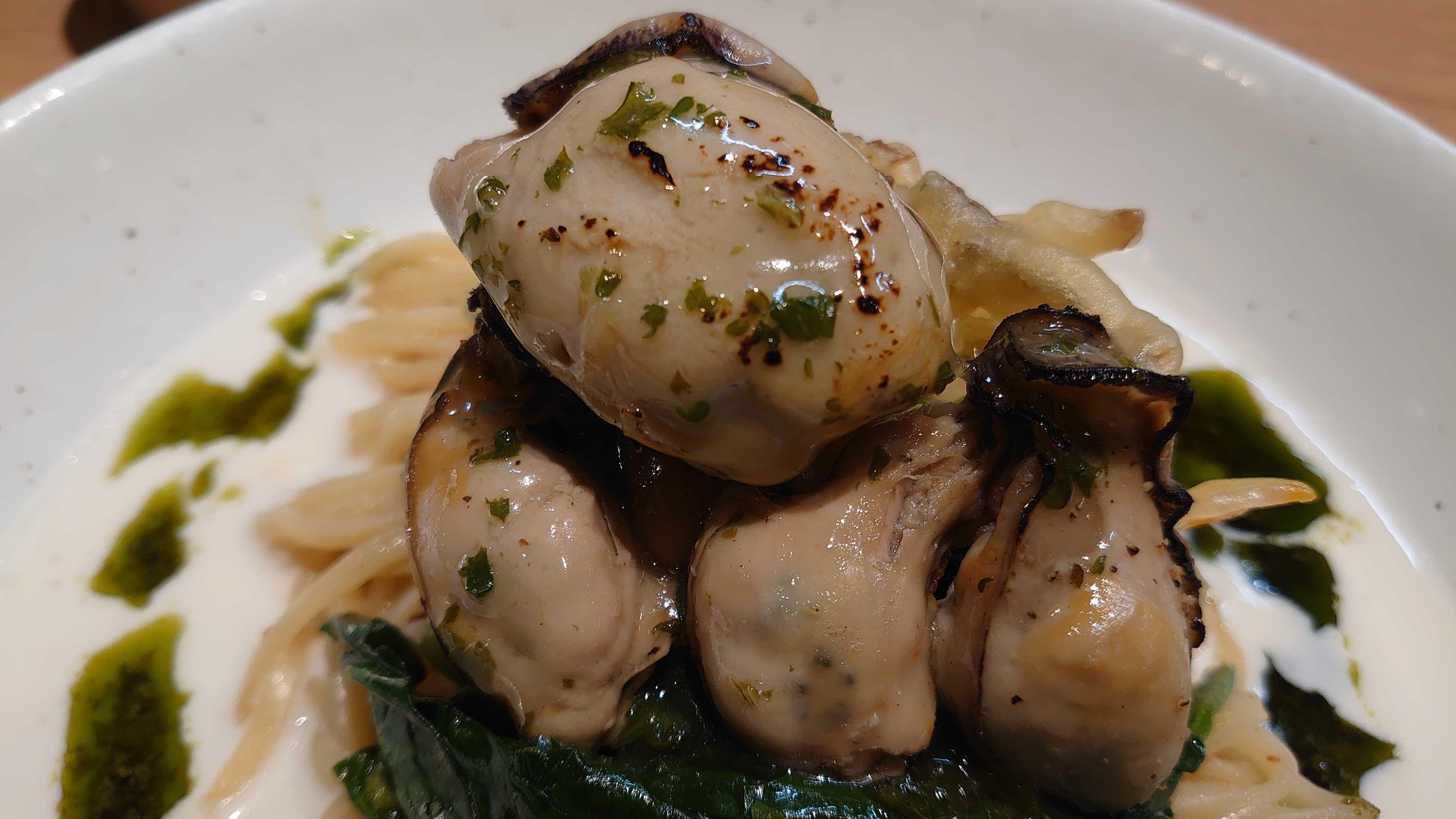 🦪大粒の牡蠣のレモンマリネ、パセリの和出汁の餡かけ