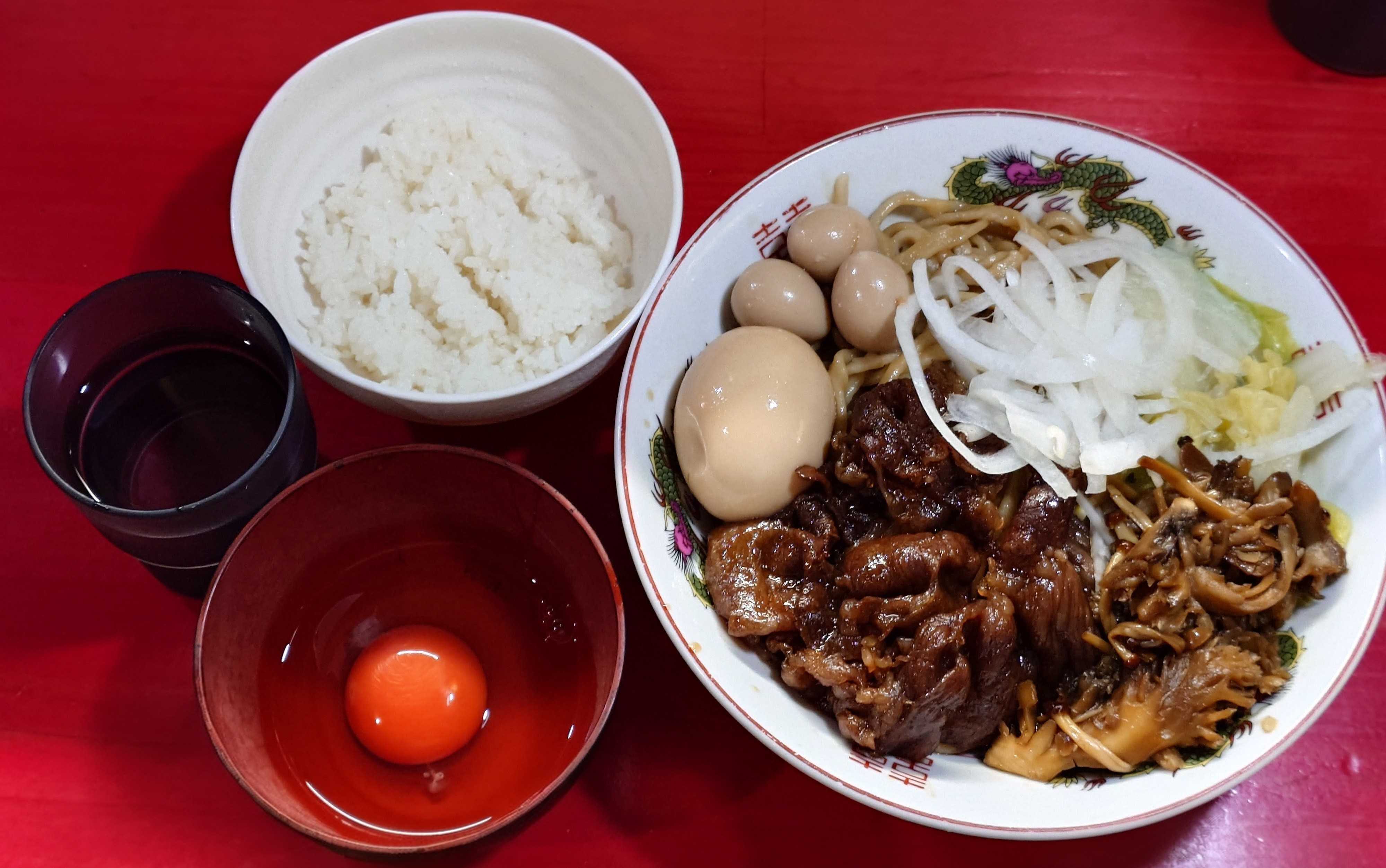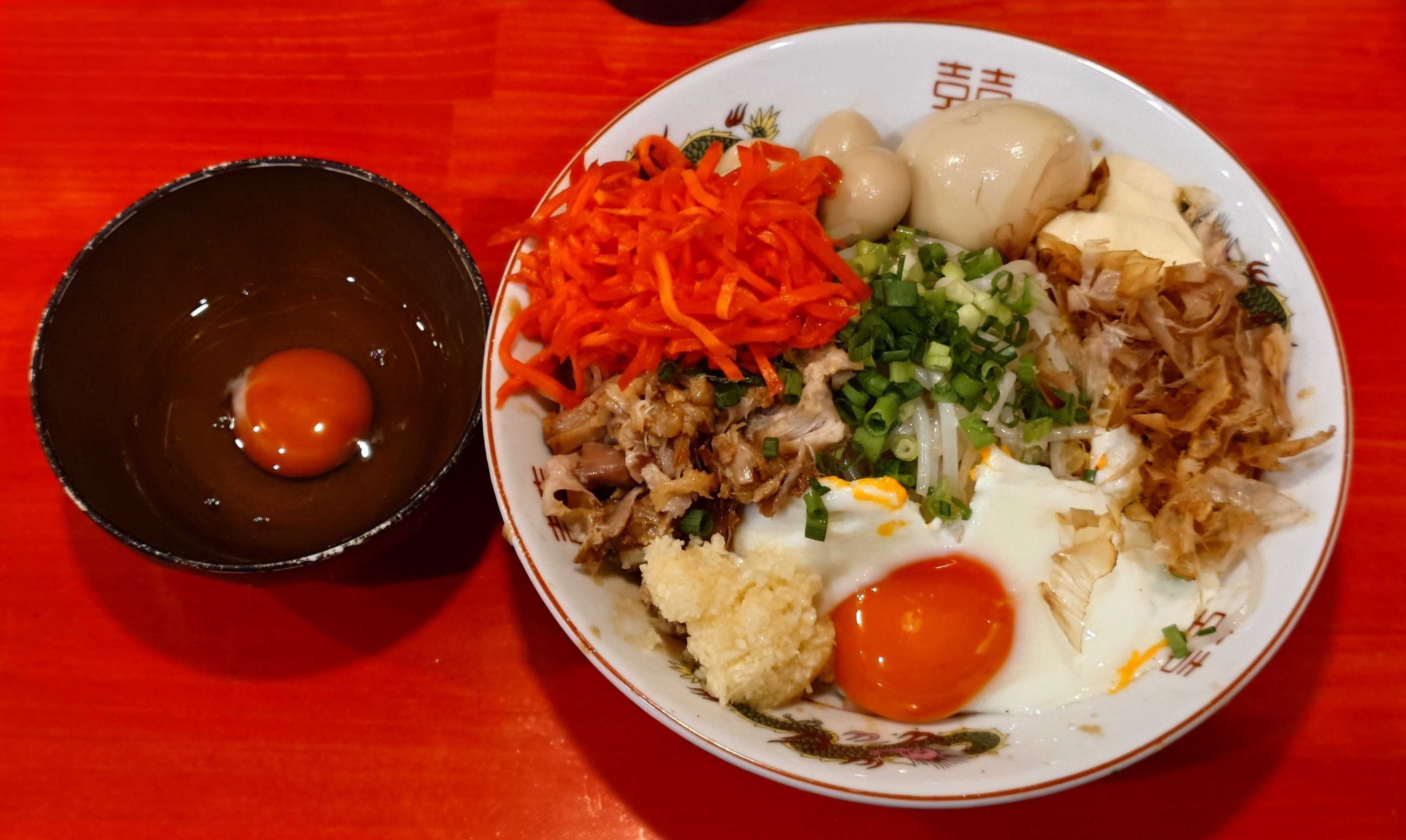 🦅ラーメン鷹の目 川口店埼玉県川口市栄町3-8-8🐮和牛すき焼きまぜそば(限定)(3→2)🥚味玉+🥚生卵+🥚味付けうずら+🍚追い飯(50円券)🥚(🤳)フォロワーサービス+店内で生卵追加(100円券)🗣️無料トッピングはニンニクのみ。(私は頼まず)A5ランクの黒毛和牛を使った特別感満載の鷹の目の限定📣麺量は通常300g!350g以上は100円券を購入して下さい😋麺量は400gまで対応、450g以上は対応不可です😋麺量は50gずつ減らす事ができます、私は🗣️200gで注文😋📣10/25(土)、10/26(日)の土日限定の数量限定販売でしたが想定を上回ったので、10/26(日)の販売は中止になりました😋📣11/1(土)、11/2(日)に振替するみたいなのでもし行く予定だった方は、来週準備して下さい🦅(川口店)🏃↑和牛すき焼きまぜそば麺量300g→200gでも生卵が足りませんでしたね、甘辛ダレが沁みた鷹麺は食べ続けてるうちに味変希望に、追加で生卵(真っ赤卵)を購入、鷹麺、すき焼き飯で〆た😋無料トッピングの選択肢はニンニクのみです。↑デフォルトトッピングA5黒毛和牛、エリンギ、長葱、無料トッピングなし有料トッピング味玉、味付けうずら、真っ赤卵(追加分)フォロワーサービス真っ赤卵↑味玉パッカーン↑店の入口看板最後まで読んでいただき、ありがとうございました。