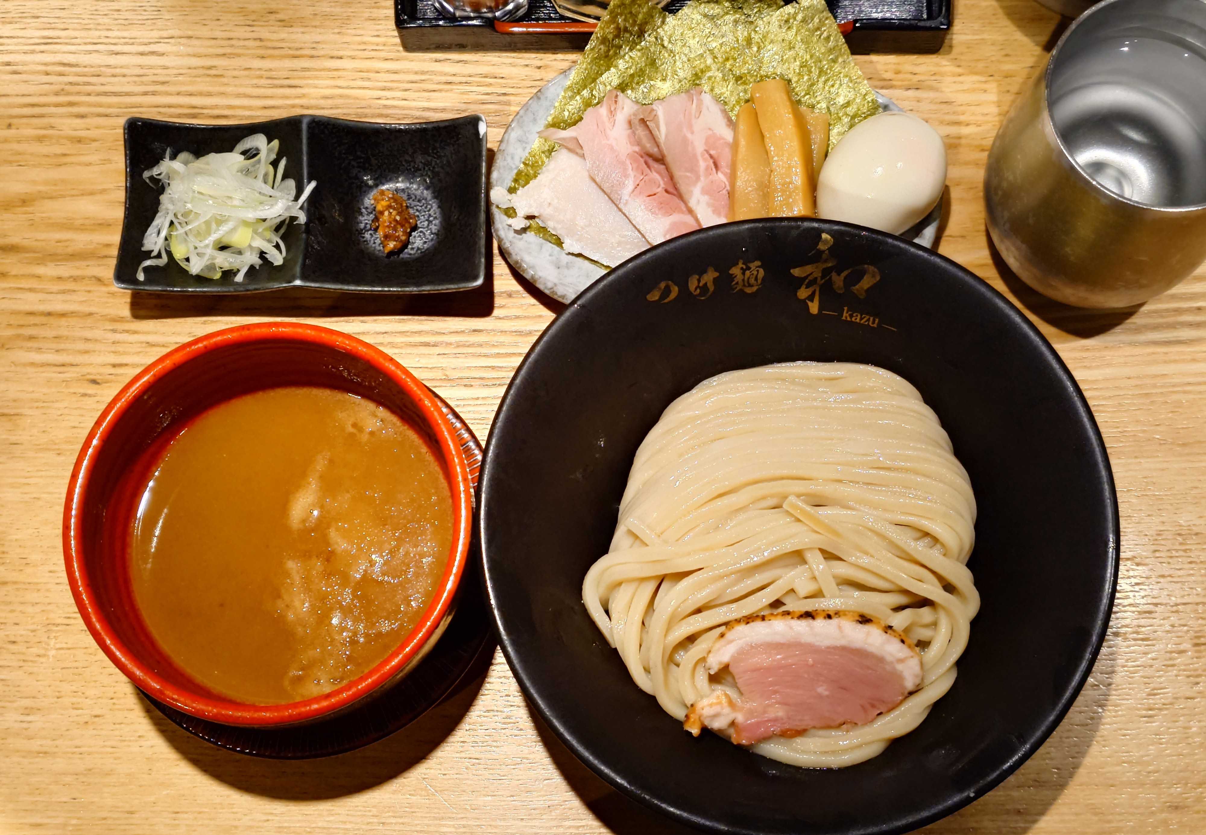 🎪大つけ麺博 Presents 秋の新作ラーメン祭東京都新宿区歌舞伎町2-43◼️つけ麺和 -kazu- 東京本店東京都足立区西竹の塚1-12-9 共栄ビル 1階つけ麺和 -kazu- 東京本店高級のどぐろ昆布水つけ麺極上君オススメ盛2018年創業の足立区竹ノ塚の人気店『つけ麺和』店主は亀有の名店『つけ麺道』で6年修業し独立。↑高級のどぐろ昆布水つけ麺+極上君オススメ盛り↑こちらは撮影ブースで撮影したものですまず店主のオススメ通り、のどぐろスープを先に一口堪能😋雑味のない香り豊かな旨味あふれるのどぐろ汁が凄旨😋続けて、全粒粉麺をそのままに、藻塩をつけて美味い😋続いて、のどぐろの旨味を抽出したなスープに絡め美味い😋〆は麺に浸ってた昆布水で割り美味い(渡し口にスープ割ない)↑極上君オススメ盛鴨チャーシュー×5、豚バラチャーシュー×5極太メンマ×2、スイーツ味玉、海苔×3(スイーツ味玉はトッピングをし忘れてる、気がつかず😅)極上君オススメ盛りは、頼んだ時に、鐘🔔が鳴りました😁↑入口最後まで読んでいただき、ありがとうございました、