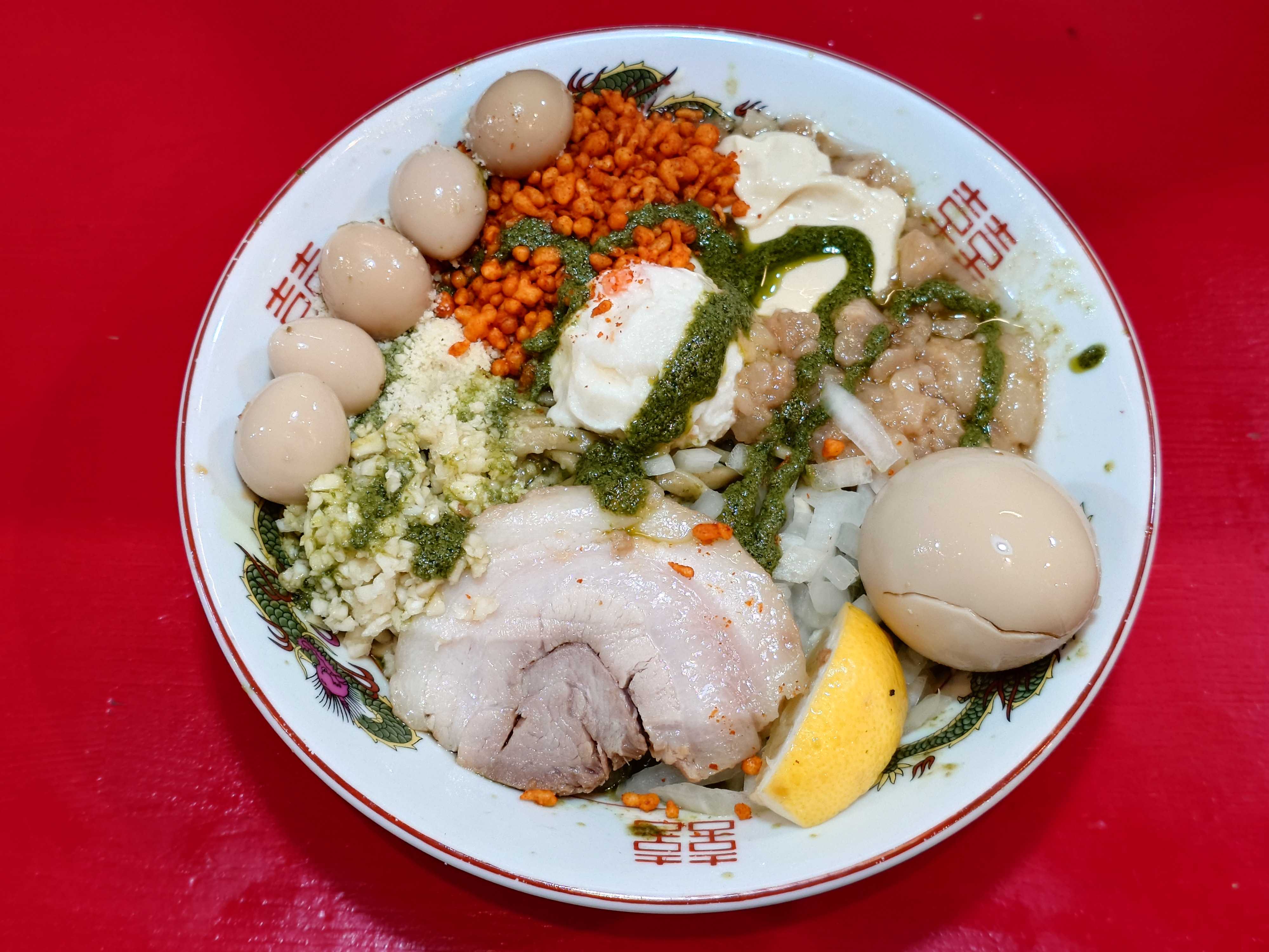 🕋ラーメン鷹の目 獨協大学前本店埼玉県草加市栄町2-9-12🎉11/1(土) 🎉11/2(日) 🎉11/3(祝) 3日間限定🐷焼豚祭と獨協大学雄飛祭限定を同時開催中⚡️二刀流な祭、あなたはどっちを選ぶかな❔️🤔 獨協大学 "雄飛祭"ソースまぜそば(限定)(3→2)+🥚味玉🥚生卵🗣️ニンニク、ガリマヨ、紅生姜マシマシ(50)🤳🈂️味付うずら (フォロワーサービスは味付うずらor追い飯)↑獨協大学"雄飛祭"ソースまぜそば濃厚ウスターソースの香りが鼻腔👃を突き抜ける⚡️ソースが沁みた鷹麺、これに具材が絡んで美味い😋太麺の焼きそばという感覚でも良いと思いますねこのテイストなら青海苔が欲しいとも思いました😋↑獨協大学"雄飛祭"ソースまぜそばデフォルトトッピングほぐし豚、ヤサイ、花鰹、万能ねぎ、真っ赤卵の目玉焼き無料トッピングニンニク、ガリマヨ、紅生姜有料トッピング味玉、生卵↑味玉パッカーン↑無料トッピング、参考にしてください。雄飛祭ソースまぜそばはニンニクorショウガ、マヨネーズorガリマヨ、紅生姜から選択私はニンニクを選択しましたが、食後の感想としては、ソースの風味が消えるので、ニンニクはオススメしません😅↑獨協大学前本店、店入口のポスター(獨協大学前"雄飛祭"ソースまぜそば、焼豚祭を同時開催)↑建物外観最後まで読んでいただき、ありがとうございました。