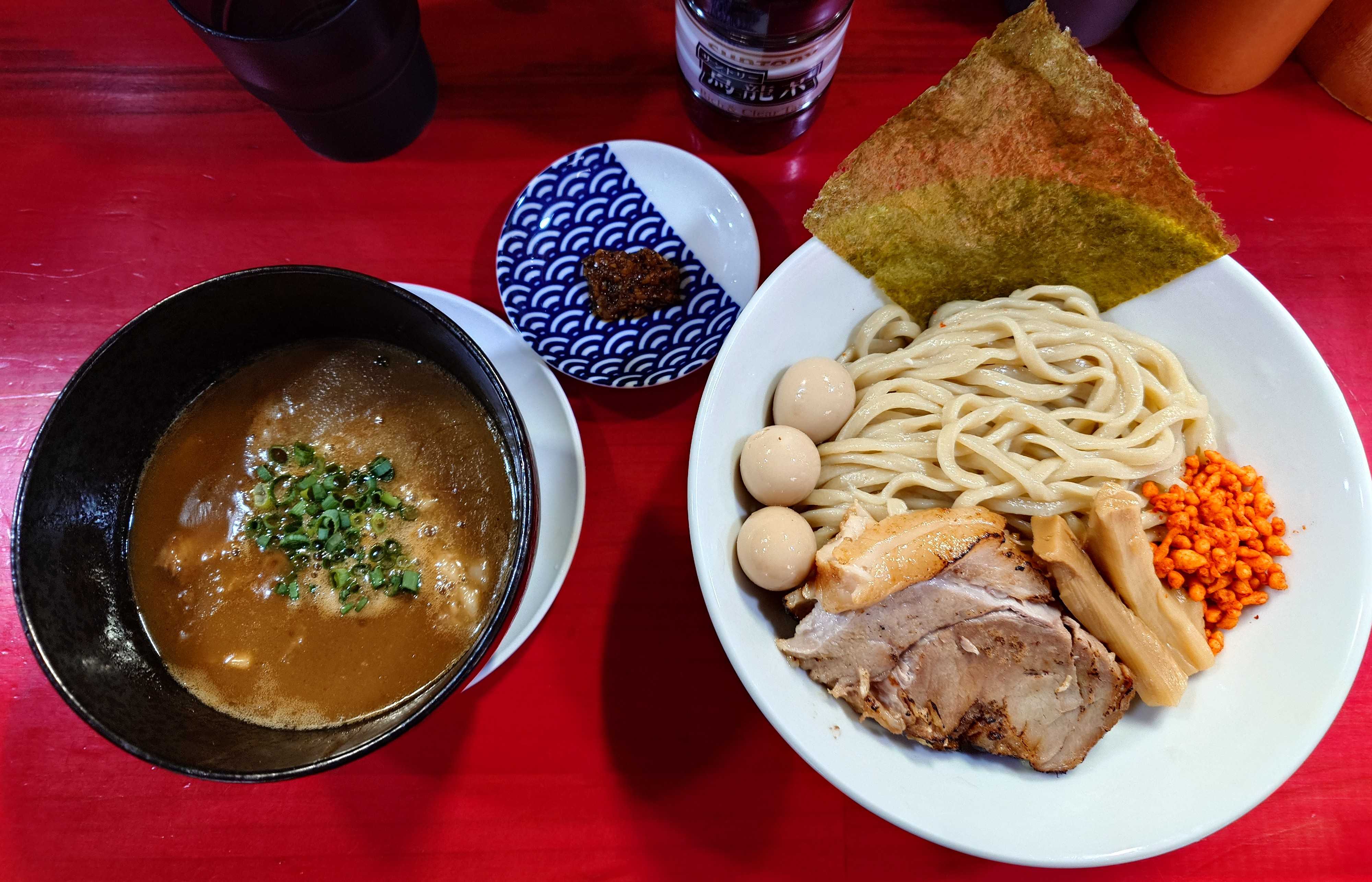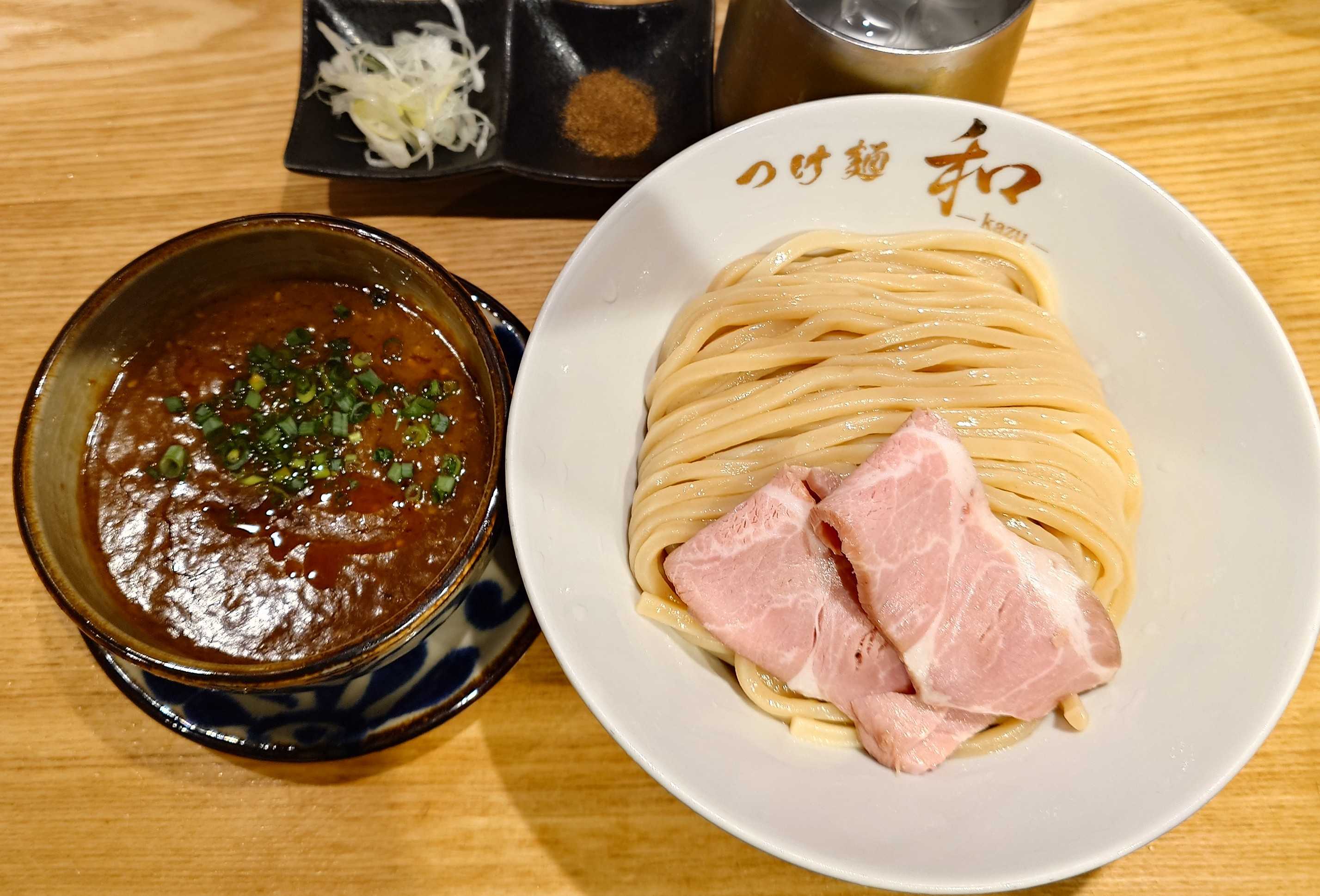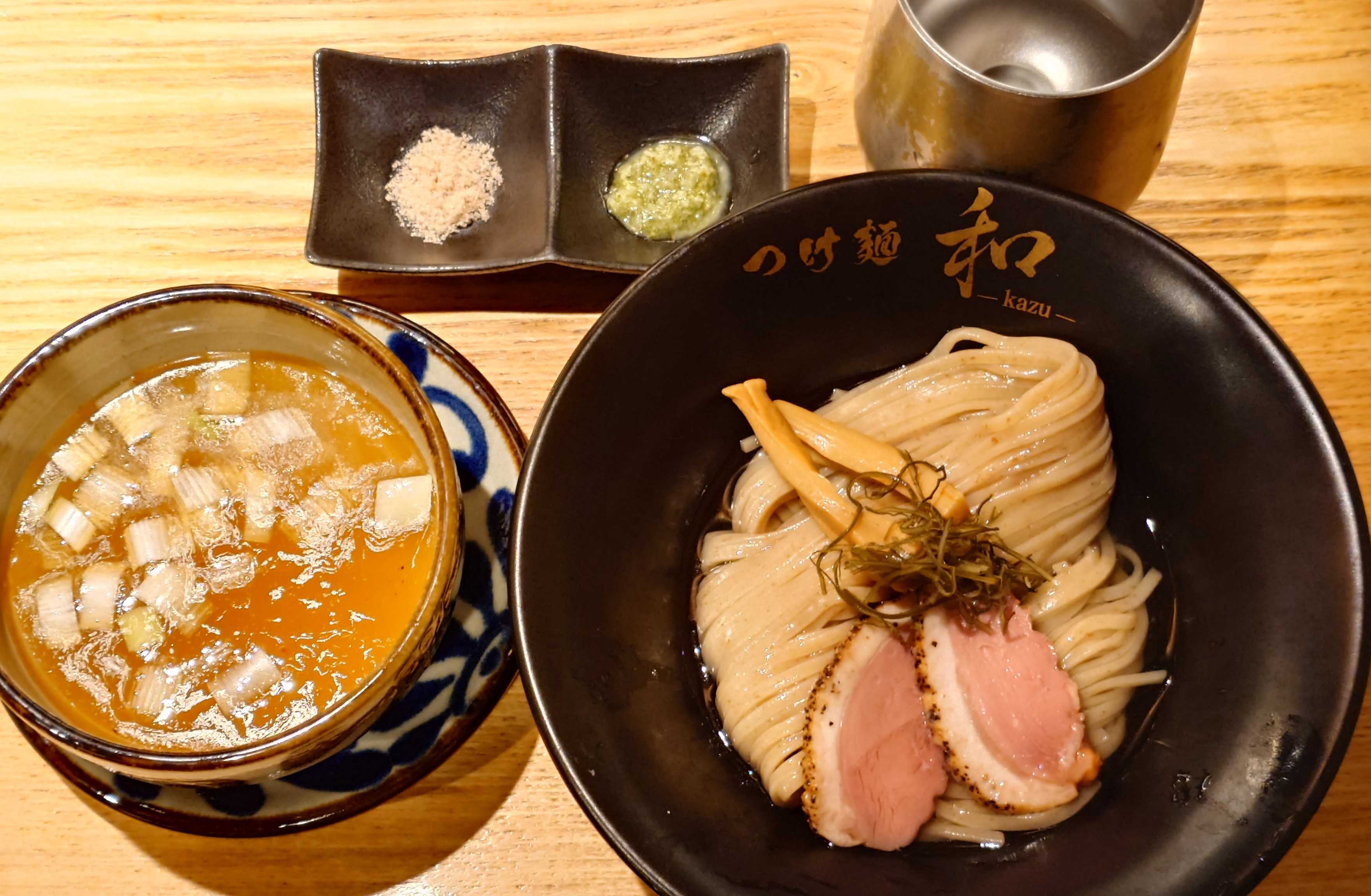 ◼️つけ麺和 -kazu- 東京本店東京都足立区西竹の塚1-12-9 共栄ビル 1階大つけ麺博(新宿)の高級のどぐろ昆布水つけ麺が10/28に限り、店舗(竹の塚)でも食べられる◼️🏃高級のどぐろ昆布水つけ麺(限定)↑高級のどぐろ昆布水つけ麺(限定)まずは大つけ麺博で店主にオススメされたスープを先に一口今回は大つけ麺博のスープに鶏を加え、余韻が残る旨味に😋冷たく〆られた昆布水に浸る麺をそのまま藻塩で堪能😋続いて、のどぐろ汁+鶏出汁のつけ汁につけて美味い😋↑高級のどぐろ昆布水つけ麺(限定)トッピングは鴨チャーシュー2枚 (鴨チャーは300円で追加可能)、メンマ↑鶏出汁を加えて、後に残る旨味のつけ汁が美味い😋↑藻塩、ジェノベーゼジェノベーゼは居山大将(八咫烏)との自家製で良い味変😋↑店舗入口↑今日(10/28)は限定営業、昆布水つけ麺のみの販売です。(気まぐれ丼とかは頼んでる方いましたので丼は大丈夫かと) ↑建物外観(30分前PP)開店時には10人超行列。最後まで読んでいただき、ありがとうございました。