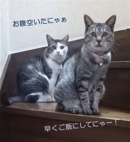 あけましておめでとうございますっ本年もよろしくお願いします 我が家には、せっかく牛柄の子が2人+1人もいるってのに、それを大いに活用できず、至って普通の、まるで手抜きのような年賀状にしてしまったもじゃいこです。牛柄活用には今年がチャンスだったのに、、、次は12年後、、、それまで元気でいてもらおうっと^^昨年は本当に色んなことがあって、ゆっくりと息つく暇もなかったような気がしますが、いつも皆さんに励まされ、応援してもらって頑張ってこれた一年でした。今年もどんな大波にものまれる事無く、頑張って乗り切っていきたいと思っていますので、引き続きお付き合いのほど、 よろしくお願いしますm(_ _)m さてさて、年明け早々、、、しかも元日の夜に、またまた困ったおぼっちゃまによって、今年も波乱含みか・・・と思わせることが。 お隣の屋根の上でSOSを出しているチュン、、、お隣に2階の屋根よりも高い木があるのだけれど、そこへ茶白に追い込まれ上ってしまったまま下りて来れず。元旦早々から機嫌の悪かった旦那を、なんとか借り出して木に登ってもらい、チュンを救出しようとしたら、パニックになったチュンは、旦那から逃げて更に上へ。てっぺんまで行ってしまったチュンを見て、旦那の機嫌は更に悪化、、、おい~~~っその後すぐに屋根までは飛び移ったのだけれど、そこから動けず。そしてSOS。年末の忙しい最中にも、屋根から下りて来れずに、はしごをかけて救出したばかりなのに、またかよっ!!下では茶白が待ち構えてるんだよ~~。カメラで撮ろうとすると隠れる。そして影から身構えてるもんだから、それを上から見ているチュンは、更に飛び降りる勇気が出ない。 ただ、「下りておいで」 と声をかけて手を出すだけに加えて、のんびりと写真なんか撮ってる私にイラっときているかのような、すごい目だね(笑)もうさ、年末の感動の再会を果たして以来、イブが我が家に軟禁されているのが分かってしまったから、我が家の周りから離れずにいるんだよね、茶白。そんなもんだから、テンの散歩帰りに待ち伏せして私と一緒に帰って来れないと、茶白に完敗したチュンは、家の前で待ち構えている茶白から逃げるしかない状態。だったら外へ出なきゃ、、、というか、私も出さなきゃいいんだけど、ものすごいストレスになるようなのね、外へ出なきゃ(´~`;;小一時間後、まるで落ちるかのように壁伝いにざざざっと下りてきたチュンは、一目散に家の中へ走りこみ無事帰宅。はぁ・・・ 茶白が離れずにいる原因のイブ、本当に穏やかでいい子です。チビッコ達もだいぶイブに慣れてきたのか、シャーシャーと威嚇することはなくなってきたよ^^こんな風に一緒に日向ぼっこも出来る様になったしね。一日のうちに二度ほど、ゲージから出てゆっくり歩いたりとのんびりさせているけれど、足を引きずることもなく、ちゃんと歩けるようになりました。そんなイブを見ても、箱入りおぼっちゃまのエムは、なんの関心も、、、というか、チュンに対する対抗意識みたいなものはまったくありません。見てみぬフリって感じかな。チビッコ達を遊びに誘って、取っ組み合いみたいな真似事もするようになったし。その様子を動画で撮りたいのだけれど、いつも突然どこかで始まるので、カメラの準備が間に合いません。遊んでやってる姿が恥ずかしくて撮られたくないのかも、、、と思ってしまうくらい、私のいないところで始まる( ̄▽ ̄;;あの巨体(笑)で、万が一本気でも出されたら、、、という不安がないわけでもないけれど、チビ達も負けていないようで、結局はエムが私の元へ退散して逃げ込んでくるので、心配ないな(≧▽≦;相変わらずのドタバタ一家ですが、今年も一年、明るく元気に頑張りまーす♪♪