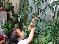 4月にほんの小さな苗だったプチトマトが、大人の背丈も越えるほど大きく成長。6月末から暖かくなると一気に成長がすすんだのには生命の神秘を感じるほどでした息子も雨の日以外は毎日毎日水をやって、古くなったり必要のない葉を取り除くのもお手伝いして一緒に育ててきましたそして先週末、ようやく1つの実が赤く実り食べごろになり主人がサーフィンから戻るのを待って、みんなで収穫祭赤くなり始めると何度も「ん!!」って指さしては食べたいとアピールしていたけど「まだよ」と我慢をさせてきたので、息子にとっては待ちに待った瞬間でした。一生懸命背伸びして、潰さず上手に採って、「洗って」とばかりに差し出す息子。洗った後、かじるも・・・皮が思ったよりかたかったので半分にして一口。「美味しい?」って聞くと、彼のYesのお返事「だ!」が返ってきて一安心残りの半分をさらに半分にして主人と私で試食。トマト本来の酸味と甘みのある美味しいプチトマトに育っていてくれました本当に美味しかった!青い実はたくさんなっているのでこれからが本番!いっぱい採って、いっぱい食べようね息子も息子なりにプチトマトを色んな意味で味わってくれると嬉しいな~。