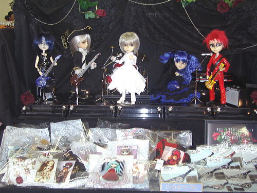 ということで、日曜日はDOLL SHOW23でした^ ^朝は落ち着いていた天気も、途中から激しい雨となってしまいましたがたくさんの方にご来場いただいてとても楽しい一日になりましたというか・・・本当に、たくさんの方がいらしててお友達、常連様とお話することに時間を費やしていましたのでなかなかご購入くださったお客様とお話できず・・・そうは言っても、わざわざ会いにきてくださってる方たちとはなるべくたくさんお話したいと思うのでそのあたりのバランスがなかなか難しいものです相方の月夜野や、ちぃちゃんがいなかったらホント、どうなってたことやら~って感じですね月夜野と二人でのんびりやってた頃が懐かしいです忙しいのは嬉しいことなんですけどねということで当日、色々あったことをまじえつつまずはブースの紹介からいきますね今回のテーマは「ヴィジュアル系バンドLIVE」・・・趣味丸出しじゃん!っていう話ですねw最近人気のヴィジュアル系の方たちは、比較的普通っていうか・・・大人しいというか・・・私の中のヴィジュアル系っていうとメイクも衣装もバリバリなイメージなんですよねメイク落としたら別人ですか?みたいな(笑)っていうか、私の中では常にX JAPANしかないわけですがw後は、マリスミゼルですねんで、こうなりました♪っつーか、背景が黒って毎度のことながら撮影が難しい><普段の撮影で黒を使わないし、会場の照明との兼ね合いもあっていつも黒背景にはなやまされます・・・公式ブログと内容がかぶっちゃうんですがひとりずつメンバーの紹介しますね♪まずはオリゾンの闇主(あんしゅ)今回、初お披露目~ですが思ったよりは自然にステージに立ってくれました^ ^今回、照明を使ったので、その光がいい感じでおさまってくれたかな?そしてお次はティムラスのアシュレイ今回、初のシルバーウィッグにしてみました照明であんまりわからないと思うけど・・・^ ^;闇主とアシュレイは、うまく撮れてないのですがこの照明の効果が、ある意味LIVEっぽい雰囲気が出た写真かな?だいたい、LIVEってすごい照明あたるから、こんな感じになってますよね?そしてイベントではすっかり常連のバトラーの雪弥(ゆきや)実は彼、3月のアイドール以外、フル参加1月は悪魔ディスプレイで魔王になり4月はホストクラブディスプレイで極悪(?)ホストになり7月はカジュアルな服と帽子のモデルになり今回が、バンドのボーカルという・・・主役から脇役、身につける服も多岐にわたってなんともマルチなモデルっぷり今回も「俺は絶対ボーカルだぜ。俺様の魅惑のボイスでイかせるぜ」くらいの勢いでしたよ・・・我が家ではダントツで俺様なんだよね多分、年明けに魔王になってから本性でたんだな、うんそして、今回、自分的にかなりドツボだったのがCRG様製作のドレスを纏ったミショネリーの銀火(ぎんか)もともと銀火には私がドレスを作ってあげるつもりだったんだけどCRG様の販売画像でこのドレスを見たらね私、作らなくてもいいやwとか思って(笑)青薔薇の美しいドレスは、某方・・・ってMana様以外ないわけですがwそのイメージで製作されていたので私もそのイメージが壊れないようにモデルとウィッグを厳選させてもらいました♪銀火、本気で似合いすぎです・・・(笑)一瞬、男の子に見えないよねwMana様はピアノ担当じゃないんだけど雰囲気的にピアノが一番似合ってて青とか薔薇っていうのは、YOSHIKIのイメージでもあるんだよねまぁ、だから今回のステージにピアノがあるんだけどさ(笑)もちろん、YOSHIKIのイメージならドラムも・・・なのできっと下にはエナメルのパンツをはいていてドラムやる時にはドレスを脱ぐのでしょうwそして最後・・・これは、今回の一番の気合でしたこの子も初お披露目、ハッシュの秀人(ひでと)ハッシュって発売当初から・・・今は亡きX JAPANのhideちゃんに似ていると言われてましたが似ているというか、まんまですよね何気にデフォ服だって、hideちゃんの某曲の衣装と同じなんだもん^ ^;でもデフォ服の衣装はね、あくまでソロの時、なんだよねだから、私はX JAPANのhideちゃんにしたかったんだこの衣装は、LAST LIVEの時の衣装X JAPANは今年、復活したけれど、hideちゃんにとっては本当にLAST LIVEなんだよね復活LIVEの時、YOSHIKIが巨額をつぎこんで立体ホログラムでステージにhideちゃんを復活させてたんだよねステージの上に、hideちゃんがいたんだよちょっと話がズレるけど実は、3月のX JAPANの復活LIVE、参戦してましたリンク先のお友達のあきらさんからねたまたまチケットを譲っていただくことができて3日あるうちの初日にいくことができて実は4月のドルショ一週間前だったにもかかわらず初日だけではどうにも我慢ができなくて無理やりアリーナをオクで奪いとって3日目も行ってきたのですその時にはもう、今回のディスプレイがLIVEと言うのは決めていたのだけどもしこの時に復活LIVEに行っていなかったら今回のhideちゃんの衣装は作ってなかったか