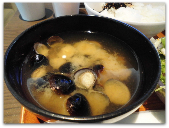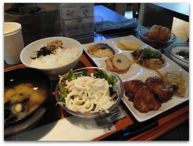 モーニング 鶏の照り焼き・サラダ・お魚・ちくわ玉子焼き・パン・ごはん しじみのお味噌汁 おいしかったです