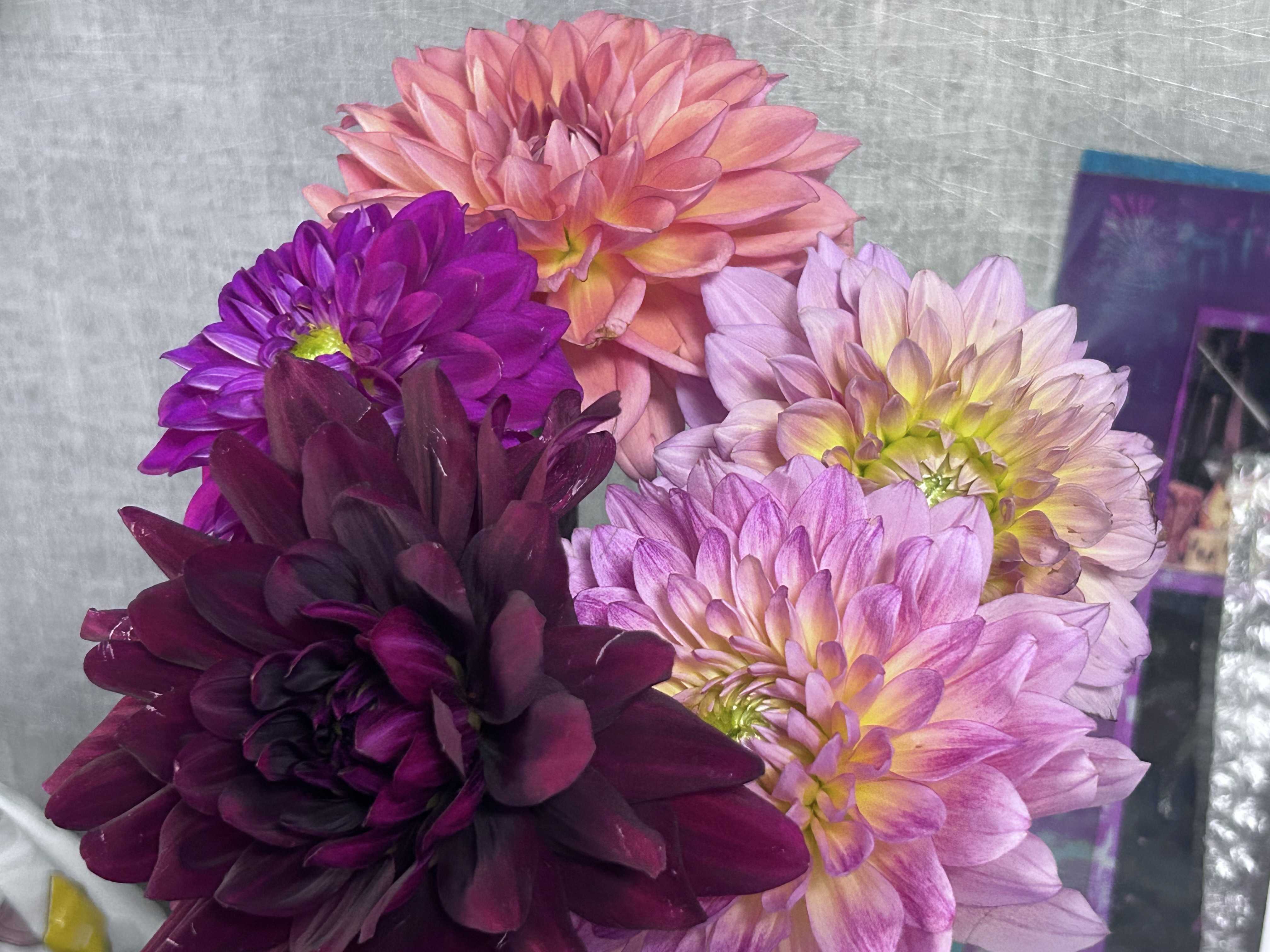 おはようございます😃 ダリアのブーケ。ダリアは、繊細な花なので楽しめるのは3〜5日と短めで、本来配送にも向いてないようです。そんなダリアが今回届きました。花びらが非常にデリケートで傷つきやすいため、取り扱いや水揚げに注意が必要で、水が蒸発するのを防ぐ「フラワーベール」などの鮮度保持スプレーを使用したりして、乾燥を防ぐと良いそうです。そして、茎をカットする、フラワーナイフを持っていたのですが、いざ使おうとしたら、どこかにしまって見つからない、、、んーっ。最近、花の名前などたくさん知ることが出来ていて、新たな発見の機会を得られています、楽しみが増えました。では、またね👋
