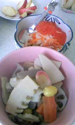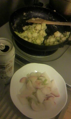 ツイッターのおかげで料理意欲が高まりぎみ♪昨日はハニーマスタードチキンを作ろうと、こぶたカフェでも講座をやってくれたジャワちゃんの本を読みながら。。。全然違うものができました(笑)。チキンを皮目から焼いて、裏も焼くときに玉ねぎも入れて、マスタードとにんにくしょうゆとはちみつの変わりにルバーブジャムで味付け。付け合わせにしようとした人参のオイル蒸し煮と生で食べるにはいまいちなカイワレを最後に入れたらもはや何料理かわかりません。おいしかったけど。nikoはきゅうりとトマトとオリーブのサラダを作ってくれました。白菜の浅漬けは、がごめ昆布をたっぷりいれてゆずの絞り汁も入れたらすごくおいしくなりました。スープはわかめとネギのかき玉汁。(温度が低くて卵液が全体に回ってしまったけど)・・・・・・今日は、鶏手羽元と大根で塩おでんを。ツイッターで話題になっていた豚と白菜の塩角煮も作りたいのだけどまだ白菜漬けがあるので明日以降にまわして。携帯替えたら画像がでかいほうれんそう、もやし、人参のナムルと昨日の白菜漬けの残り。nikoのリクエストで主食は磯辺焼き。今日のメニューは好みな味だったらしくどれもお代りして食べてました。あ~作った甲斐があった。塩おでんは、塩と昆布と鶏肉のだしだけでおいしいのです。黒胡椒を一杯振って、いただきました♪ ほかにも買ってある豚かたまり肉やささみを下処理しておこう。今日は肉ばっかり買ってしまった。(料理熱が冷めないうちに。。。) 明後日のこぶたカフェ給食はcocoちゃんのジャンバラヤ!赤ちゃんママに嬉しい企画がいっぱいです。・おんぶひもお試し会・10種~ずらり!どれがぴったり?・所得税の還付申告相談会(当日来られない方には、ラスカルさんが↓お役立ちリンクをあげてくださいました!↓)http://plaza.rakuten.co.jp/raccoonmama/diary/201101180000/・学資保険のキホン講座・花粉症対策!冬から春の養生講座先週バタバタで投票できなかった書き初めも引き続きやりましょう。願いが叶う書き初め!これ、アウトドア忘年会でお焚き上げしようか。赤ちゃんママでなくとも大歓迎。リスニングセッションやカラーセラピーの出店もありますよ。心よりお待ちしてます^^こぶたカフェの詳しいご案内はこちら↓http://kobutalabo1.blog9.fc2.com/blog-entry-512.html