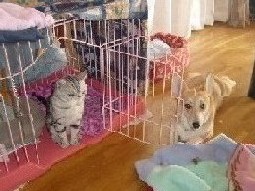ゆきおとターナの朝食です勿論大目のほうがゆきおです日によってはおかわりする事もありますターナは最近余り食欲が有りません 食事の支度をしている間にゆきおが又ターナを追い回していますと思ったら噛んでます 急いでゆきおとターナを引き離しました猛獣ゆきおは一日中部屋中を探検していますだからと言ってターナをハウスに閉じ込めて置くわけにもいきません 無い知恵を振り絞っている間にラブがターナを守っていてくれましたラブ:「私が居れば もう大丈夫よ」 ラブは今日も一生懸命お仕事をしていますラブ いつも有難うね
